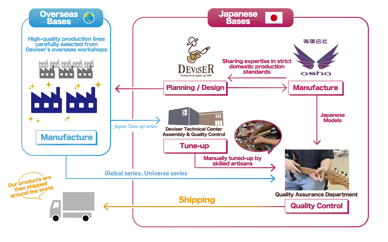 Deviser shares the quality improvement and guitar manufacturing expertise cultivated in Aska with its overseas workshops, striving to enhance quality.