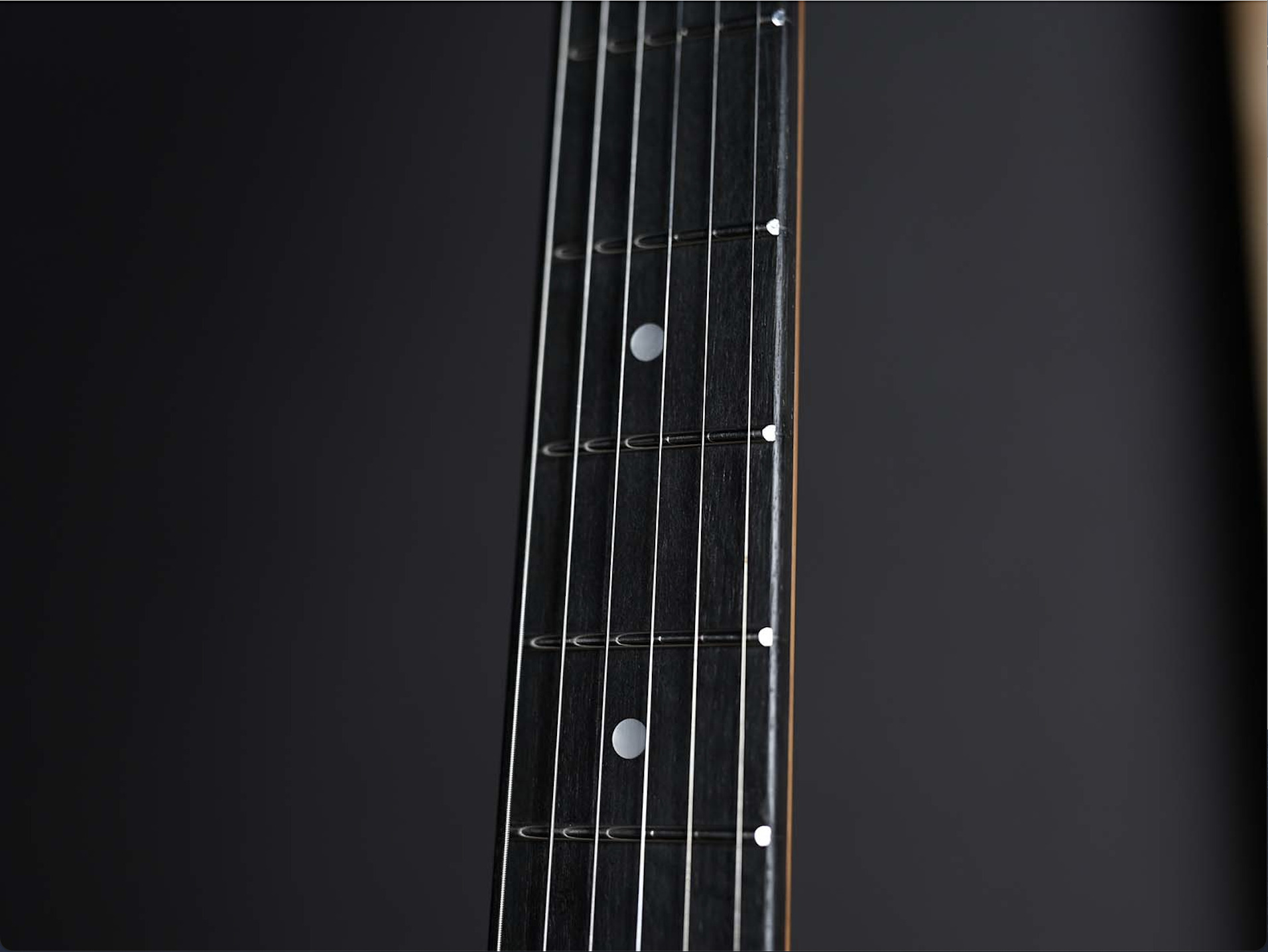 The black pearl pickguard creates a glossy contrast, adding depth to the design.
