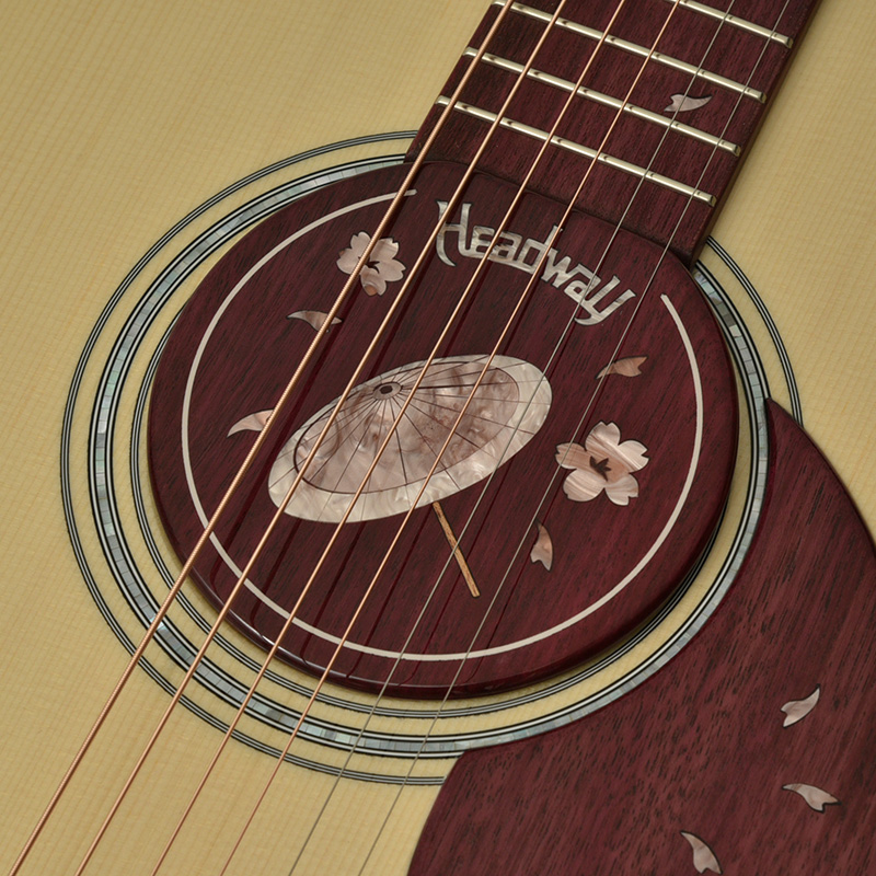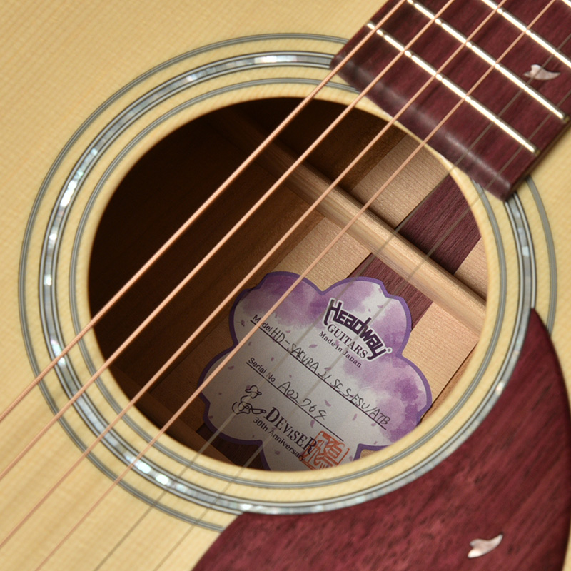 The white spruce is characterized by its soft tone with clarity and quick response. The side backs are made of 3P Yamazakura (Purple Heart), a first in the Aska Team Build Series, for a solid midrange tone. The 34 semi-forward bracing gives the midrange a bright and clean tone.