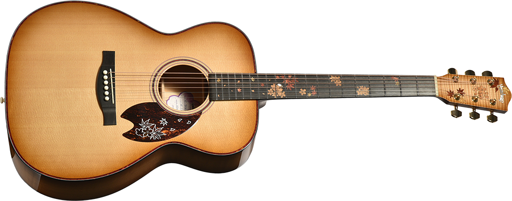 The pickguard, modeled after cherry blossom petals, uses tortoiseshell material to express the shifting colors of autumn, adorned with a delicate design where maple leaves and cherry blossoms coexist. The soundhole cover depicts a woman under a Japanese umbrella, which has become a symbol of the Sakura Guitar, depicting a scene where she stands amidst swirling maple leaves.