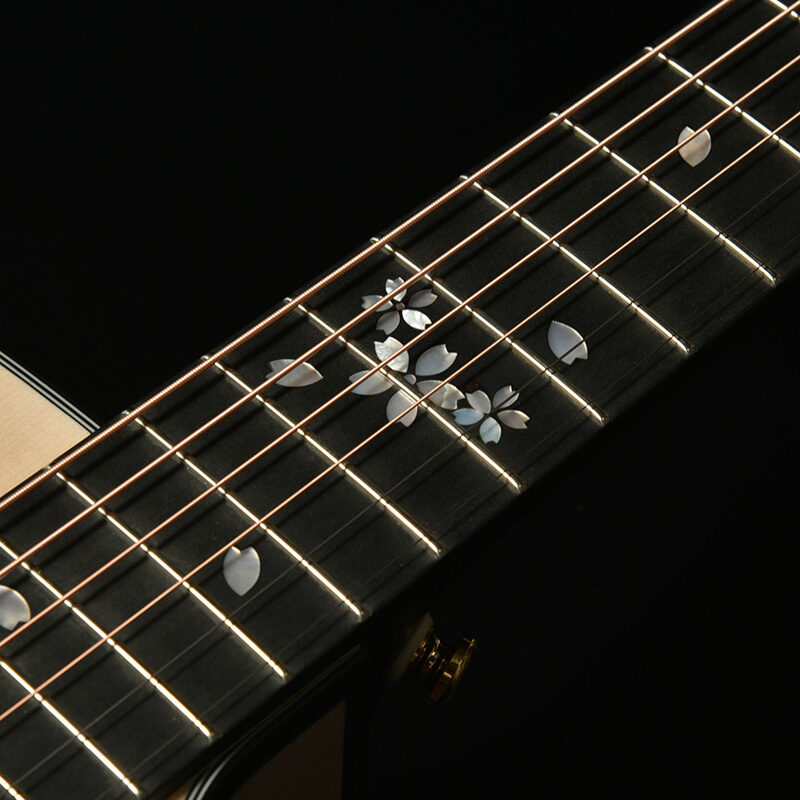 The headstock top and fretboard are decorated with a cherry blossom motif, which has been used on many Sakura guitar models. The material used for the guitar is a natural mother-of-pearl shell which changes the way it reflects light depending on the angle you view it from, making the guitar stand out even more for its unique character.