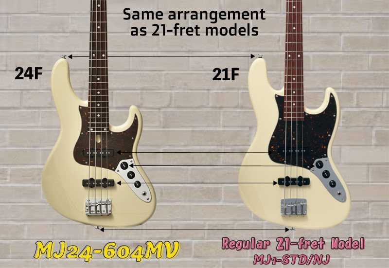 The pickup, various control knobs, bridge, and strap pin positions are configured to closely match the layout found on traditional 20-fret basses and 21-fret basses. This allows players accustomed to the traditional style to switch over smoothly and without discomfort.