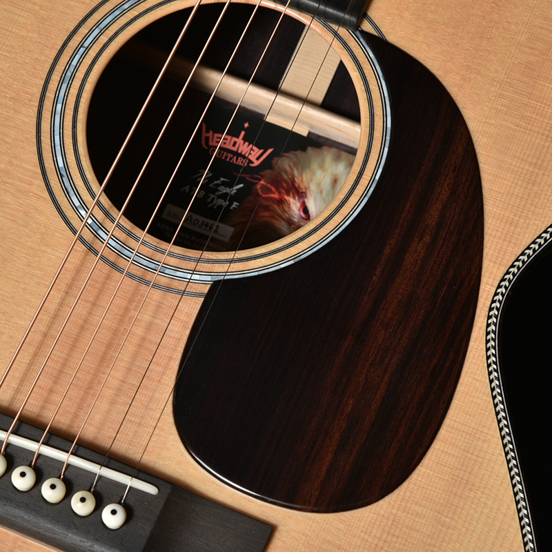 The “Mid Point Shifted X Bracing”, which is based on the normal bracing used by Momose at the time of Headway’s inception and redesigned by custom builders Yasui and Furihata with a modern twist, is used for the first time. The “Shallow Scalloped” design, which is a shallower scalloping than usual, was previously used only on Momose’s CustomShop models, but has now been incorporated into a -The Eagle- model for the first time. The tone of each note has very good articulation, and at the same time, it has a bass resonance and a round sound, all of which are enveloped by overtones.