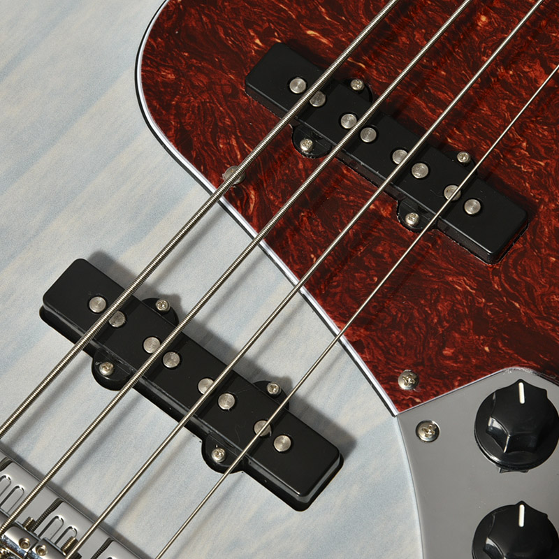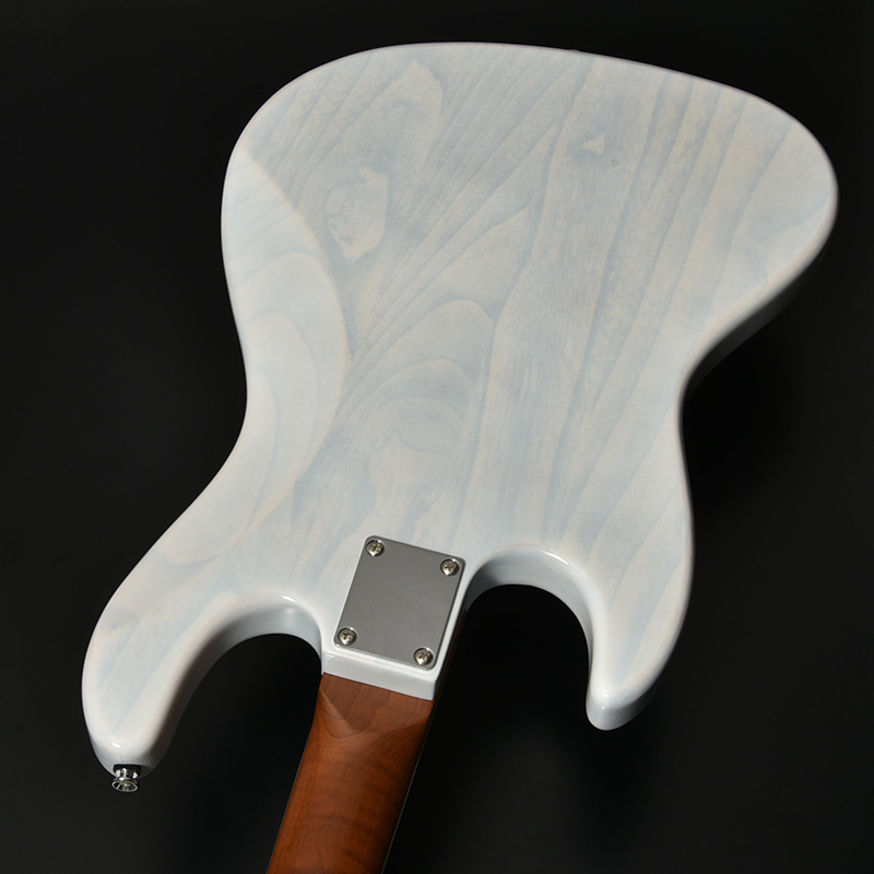 The body is crafted from ash wood, known for its wide frequency response and excellent sound projection, finished with a see-through color that highlights the natural wood grain and lets it shine through.