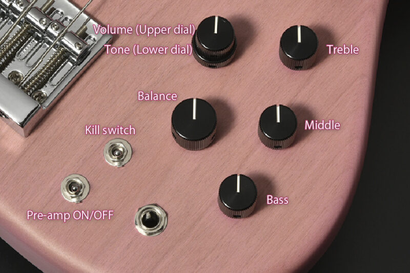 The controls have a strong lineup ready for any situation. The 3-band EQ allows for a wide range of sound-making, while the middle EQ adjusts the boost/cut of the mid-low frequencies at 250 Hz to control the presence and mixing of the bass in the band sound. Practical features include a pre-amp on/off switch for dealing with dead batteries and adjusting output during performance, a kill switch for daily use, such as breaks during rehearsals, and an output jack on the top of the body to reduce problems such as the cable being unplugged by accident. These are also specifications inherited from the headless signature basses.