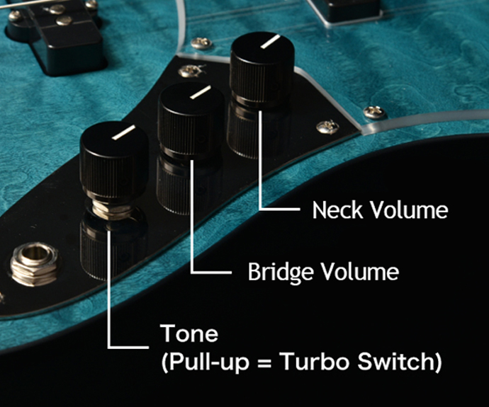 The –Turbo Switch– from the WOODLINE family is also featured on this model. Pulling up the tone knob activates the Turbo Switch, which connects the two single-coil pickups in series, creating a thick, humbucker-like sound. (※When the Turbo Switch is on, volume is controlled by the bridge Volume knob. The bridge Volume knob is bypassed at this time.)