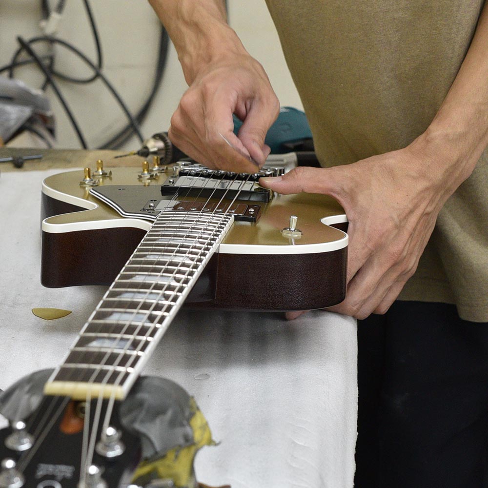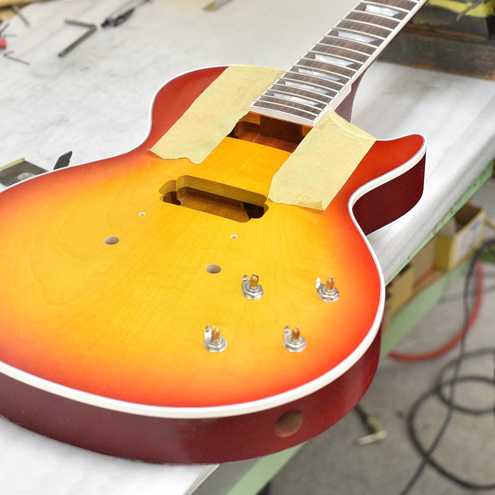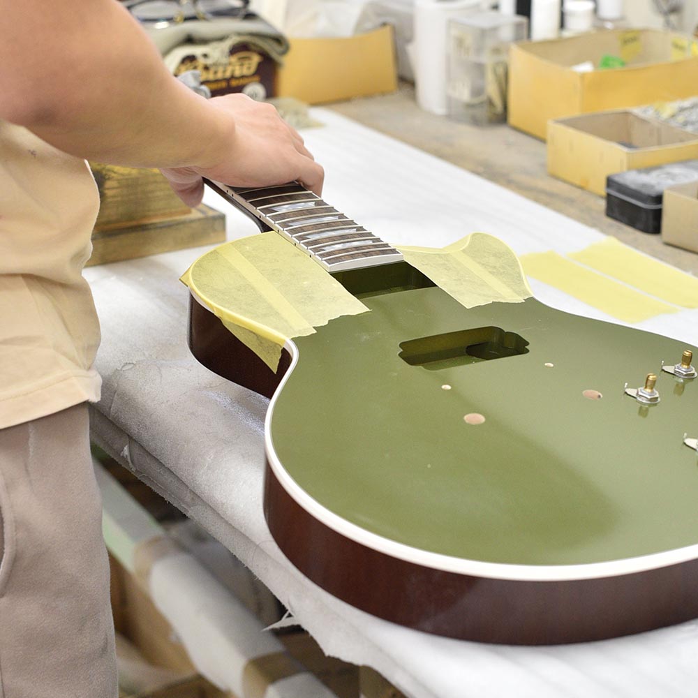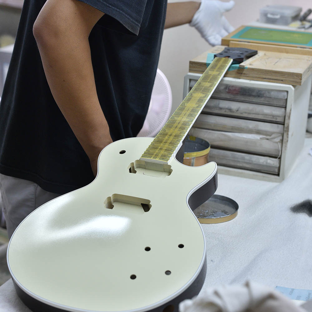 Patina(パティーナ) とは、家具や革製品などを日常的に使い続けるうちに、徐々に表面に現れる艶や色あせなど、時間の経過によって生まれる風合いを表す言葉です。 新生 DUKE において新たに採用した “Patina Finish” は、まさに年月を経て変化したような落ち着いた艶感をまとい、長年寄り添ってきた愛機のような風格をギターに与えました。 この塗装の技法上、着色層およびトップに使用されたラッカーの塗膜は一般的なグロス仕上げよりも薄く仕上げられており、ボディ材の振動を妨げることなく、木材本来の生鳴りを最大限に引き出します。