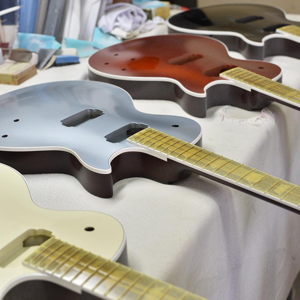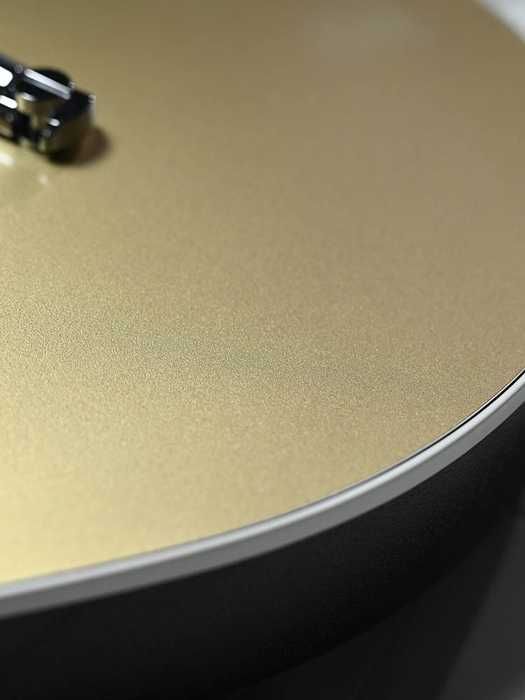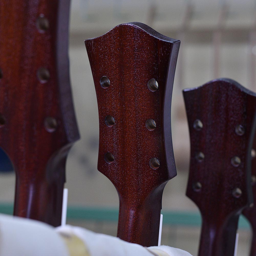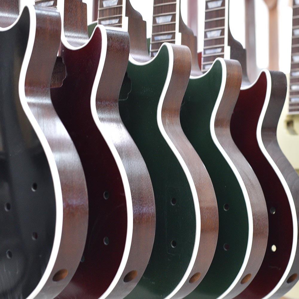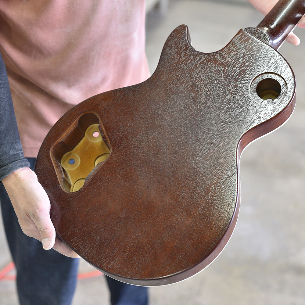 Patina(パティーナ) とは、家具や革製品などを日常的に使い続けるうちに、徐々に表面に現れる艶や色あせなど、時間の経過によって生まれる風合いを表す言葉です。 新生 DUKE において新たに採用した “Patina Finish” は、まさに年月を経て変化したような落ち着いた艶感をまとい、長年寄り添ってきた愛機のような風格をギターに与えました。 この塗装の技法上、着色層およびトップに使用されたラッカーの塗膜は一般的なグロス仕上げよりも薄く仕上げられており、ボディ材の振動を妨げることなく、木材本来の生鳴りを最大限に引き出します。