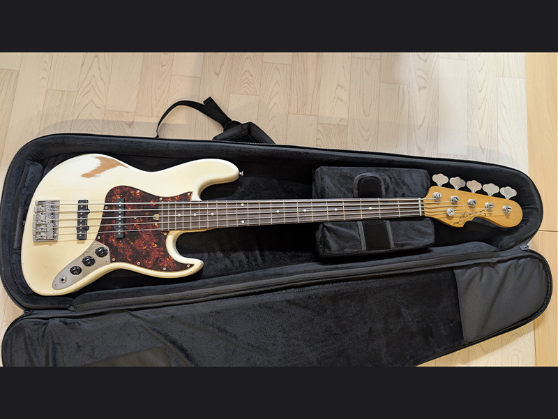 演奏したい曲の幅を広げたくて、次は5弦ベースを探しにお茶ノ水へ。 そこで出会ったのが、このMomoseのベースです。 店内の奥に掛かっていたにもかかわらず、ひと目で惹きつけられる存在感。 試奏してみると、手に吸い付くようなネックと身体にフィットするボディ、そして想像以上の弾きやすさに驚きました。