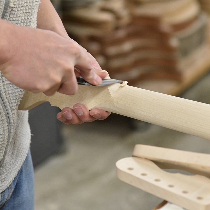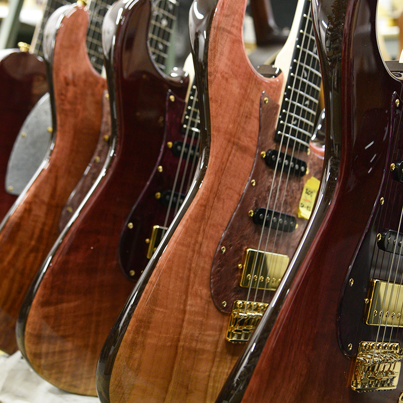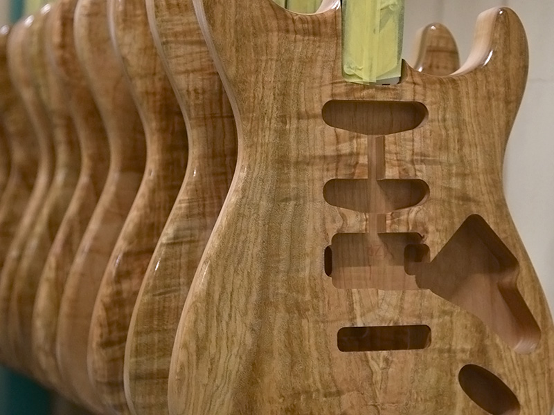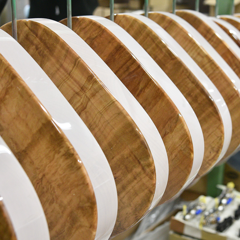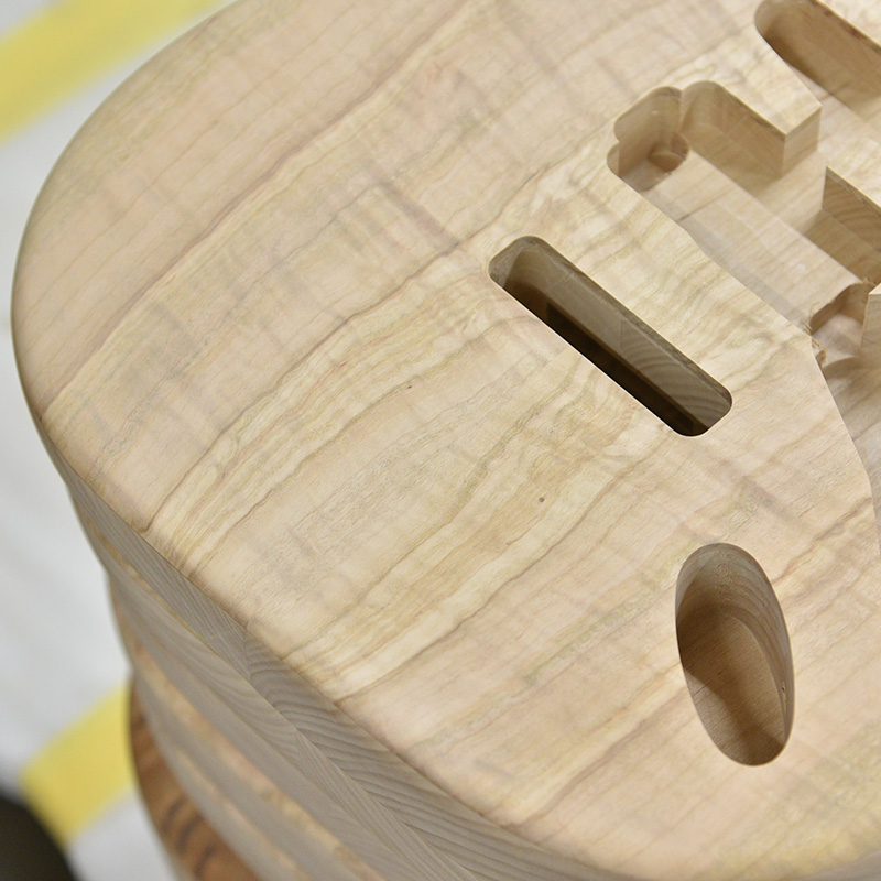 杢目の個性があるソメイヨシノを生かす為、シースルーの塗装ながら桜らしい3色に仕上げられています。まだ寒い雪に包まれる桜、そして春の気配、夜風に揺れる桜と情景を思い起こさせる色合いです。 インレイワークでは桜舞い散る様を上品に表現しながら、近年の桜モデルでテーマとなる和傘の女性をピックガードにデザインしております。