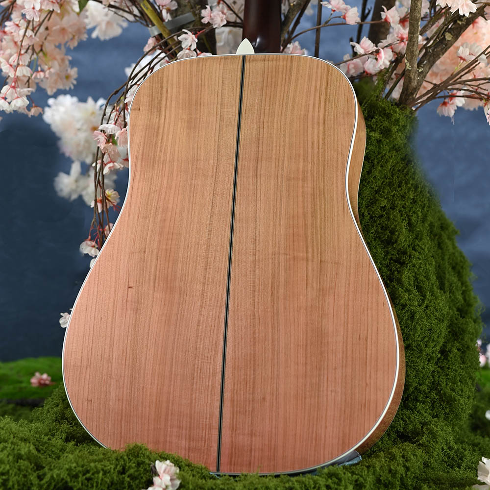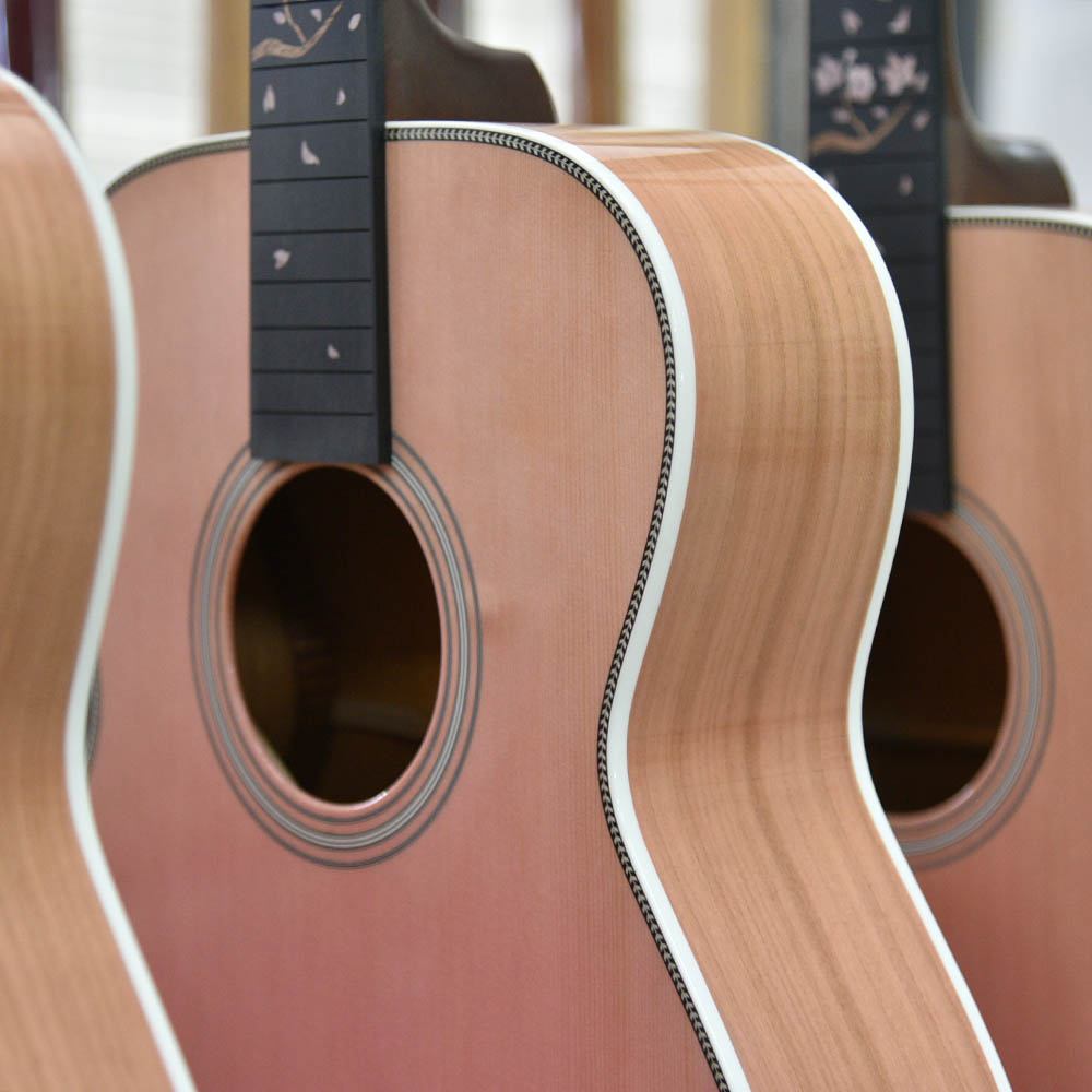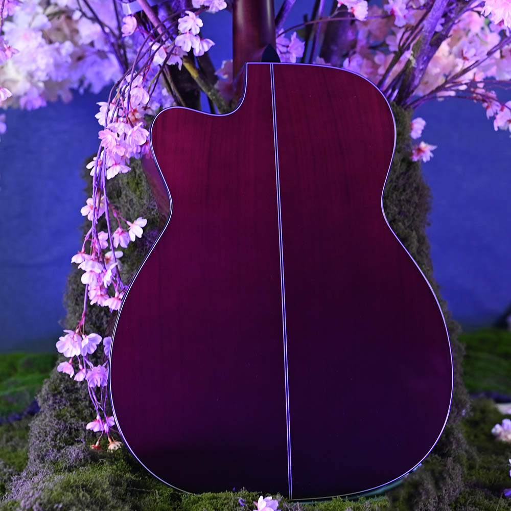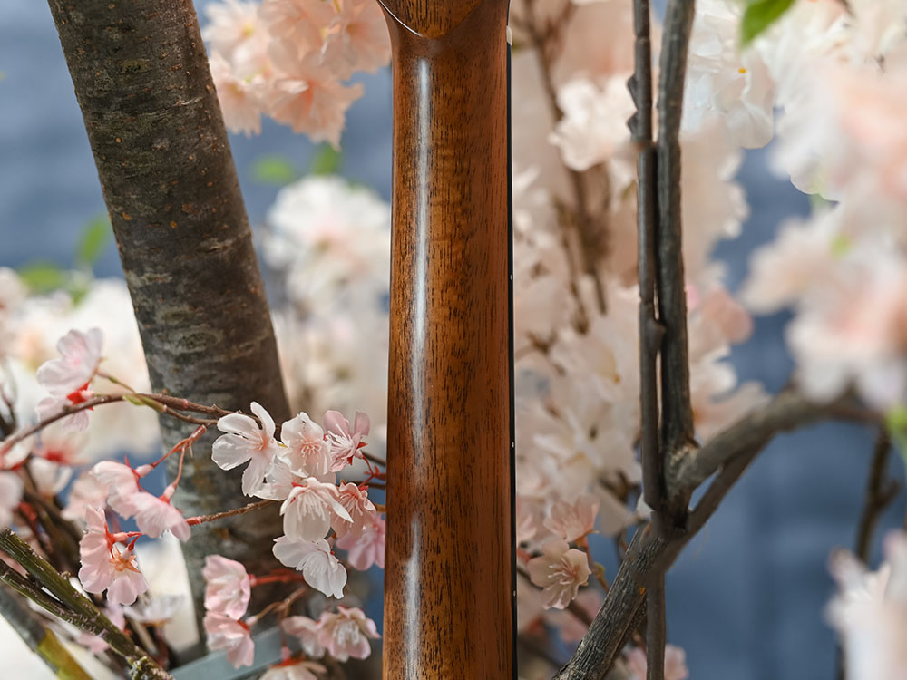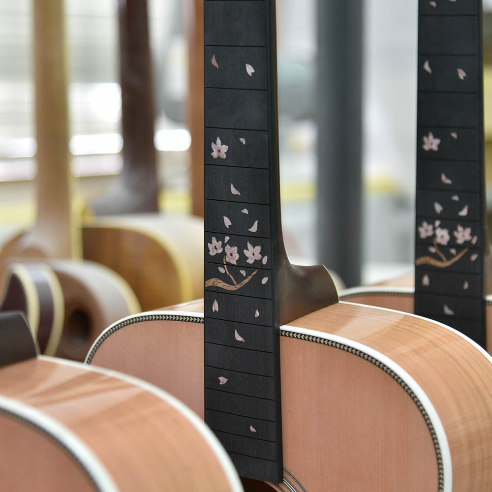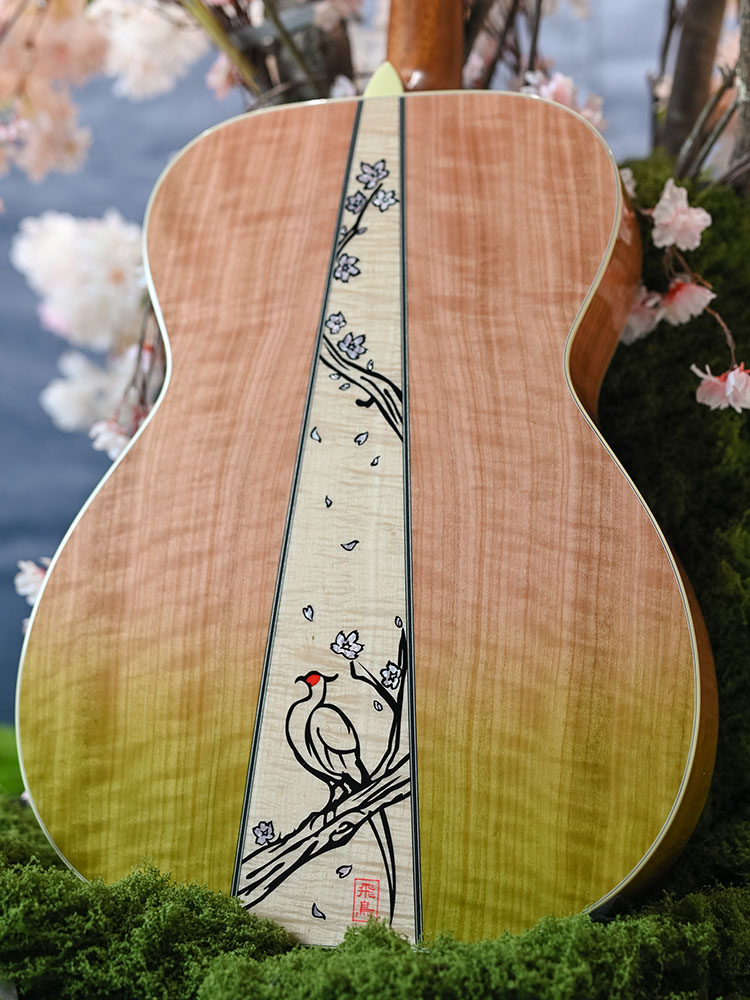 サイド&バック材として用いられた「山桜」は、張りのあるサウンドと甘いトーンと評される特有の音色が特徴です。バックは3ピース構造となっており、桜と同じく和材を代表する白く美しい楓を使用しています。