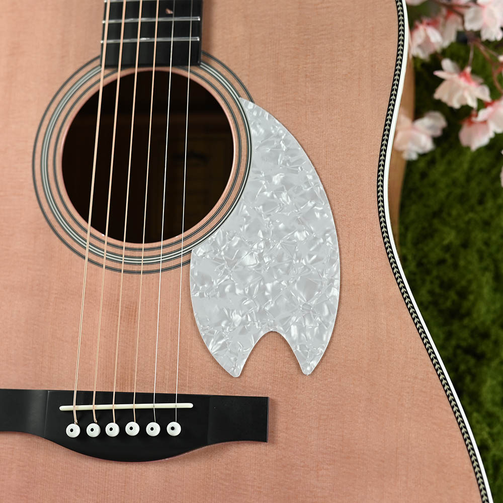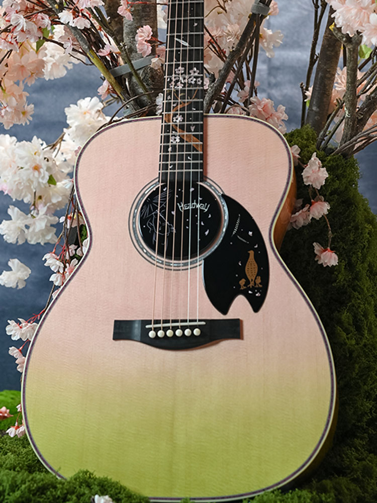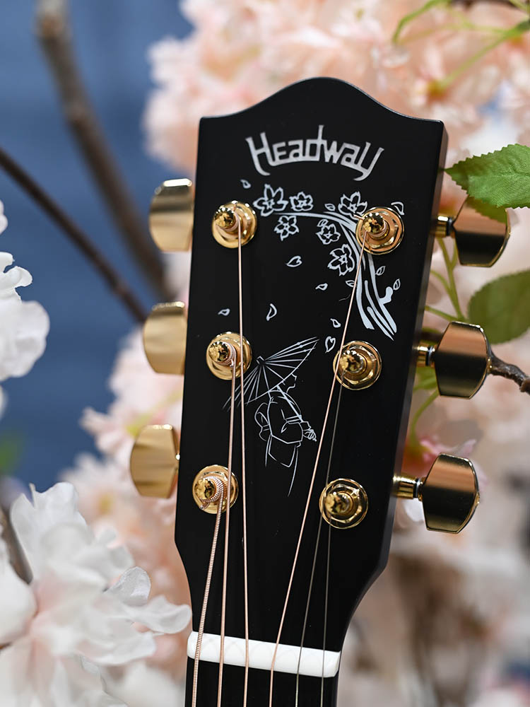 ヘッドトップには近年の桜モデルのテーマである、和傘の女性をデザイン。筆書き風のデザインが和のイメージを打ち出し、指板インレイと合わせ全体の世界観を作り上げています。