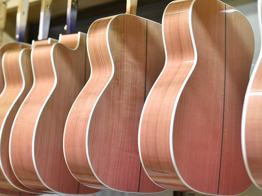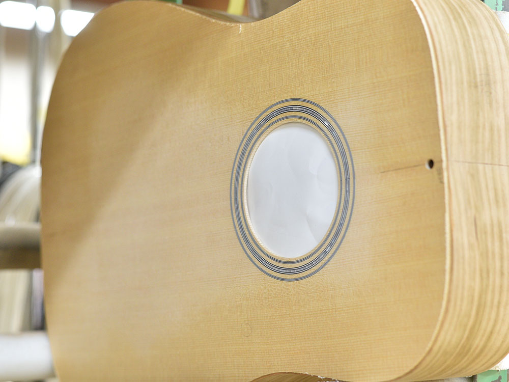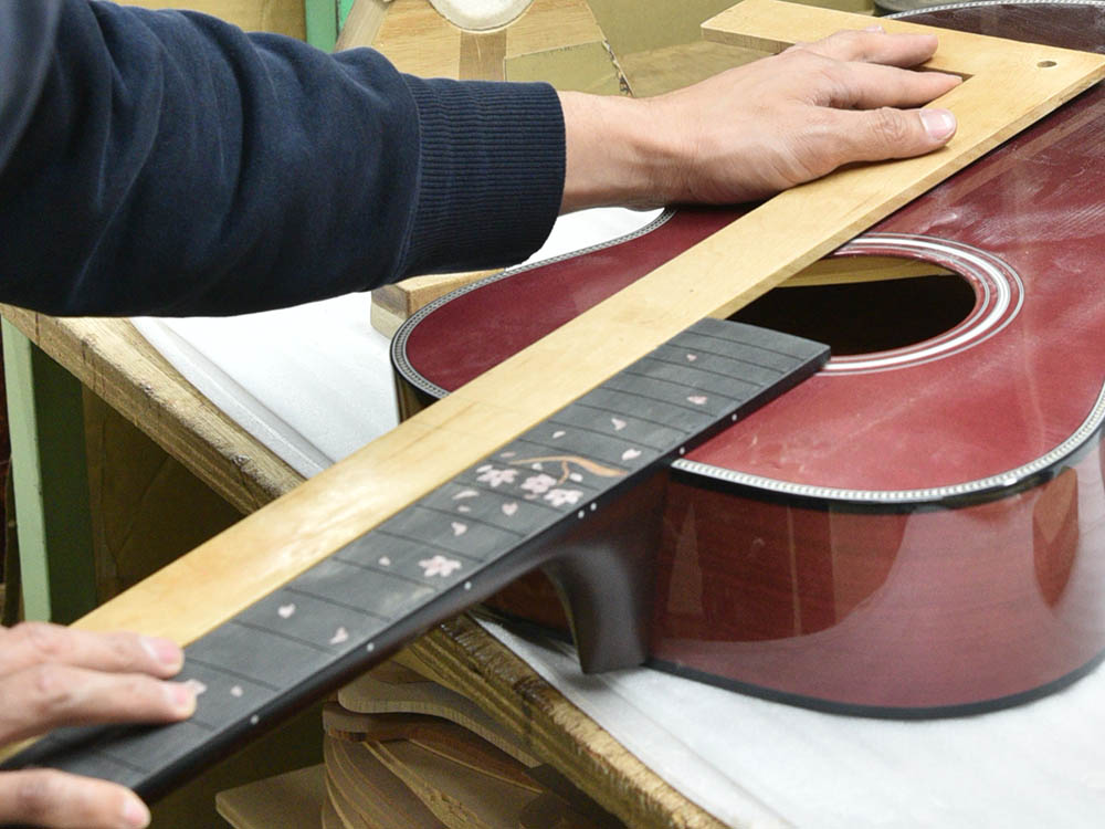 ボディとネックを別々に塗装した後、伝統的な蟻溝(ありみぞ)工法と呼ばれるジョイント方法を採用しています。近年ではより簡単なボルトなどを使用したジョイントのモデルも増えてきていますが、蟻溝方式のジョイントは接合面積も広く、高精度に仕上げればネックとボディはあたかもひとつの木材であるかの様に豊かな鳴りを生み出します。「ほぞ」と呼ばれるジョイント部の突起は、一般的な物よりも大きめに作られており、専用の治具を使用して接合します。この様に塗装後にジョイントされる方式を「後仕込み」と呼んでいます。