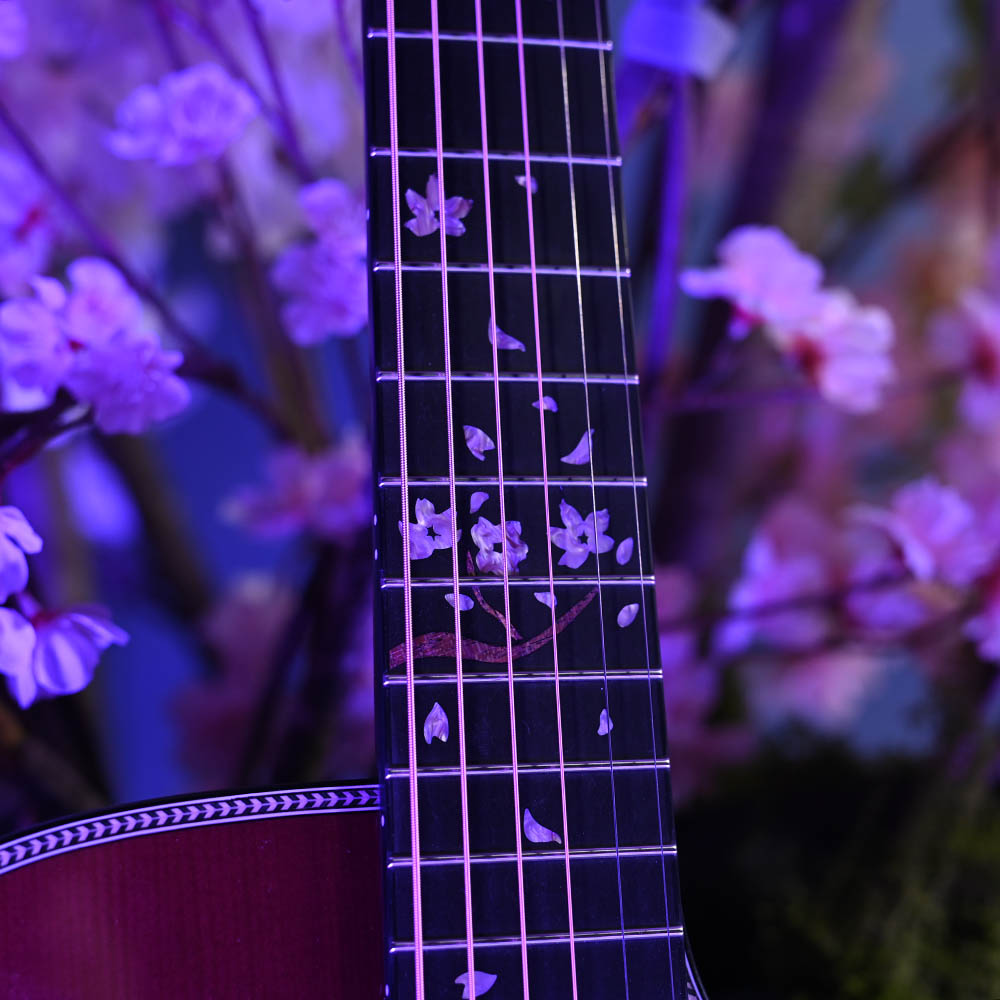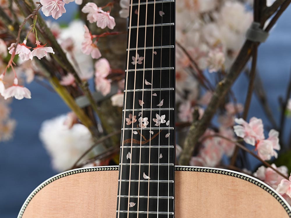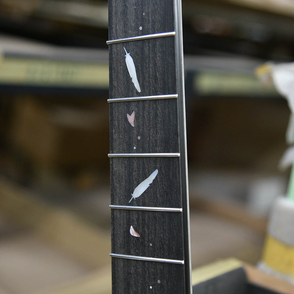 エボニー材の指板にて、インレイワークで桜の花とキジの羽がデザインされています。キジのテーマに合わせた和のテイストを目指し、天然貝や木材など複数の素材を使い分け製作しました。美しい桜の幹と花びら、そして舞い落ちるキジの羽を表現しています。