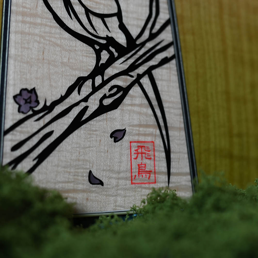 ボディバックのセンターは墨で描かれた掛け軸をイメージしております。単に塗装で墨絵風に表現するだけに留まらず、桜の花にはインレイを埋め込むなど複数の技法を組み合わせることで生まれた奥深さがあります。ファクトリーの「飛鳥」も押印されており、これは職人が1本1本手作業で押印している為、僅かな個体差が手に取った1本だけの特別感を演出します。