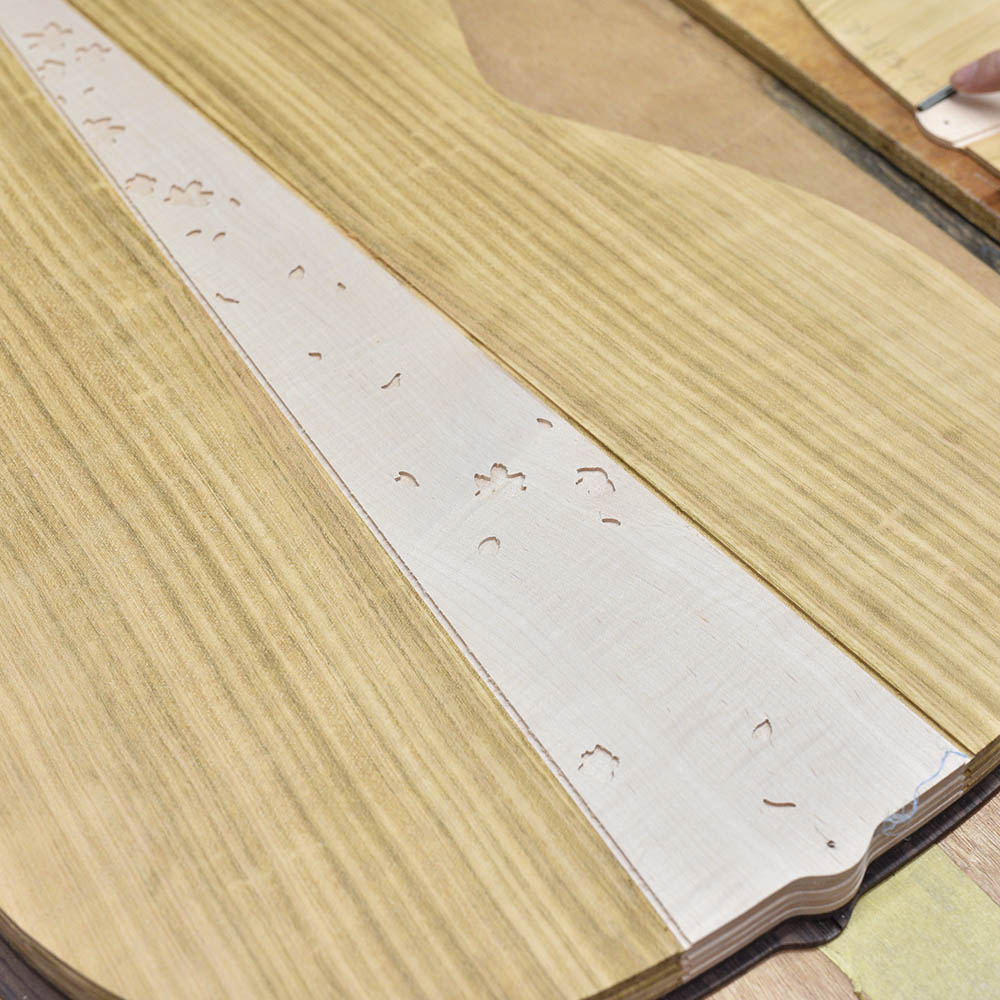 トップ材には、飛鳥ファクトリーがストックするシトカスプルースの中から、Aska Team Build Series用に厳選された材料を使用。真っ直ぐに通り詰まった杢目はサウンドの軸を作ります。