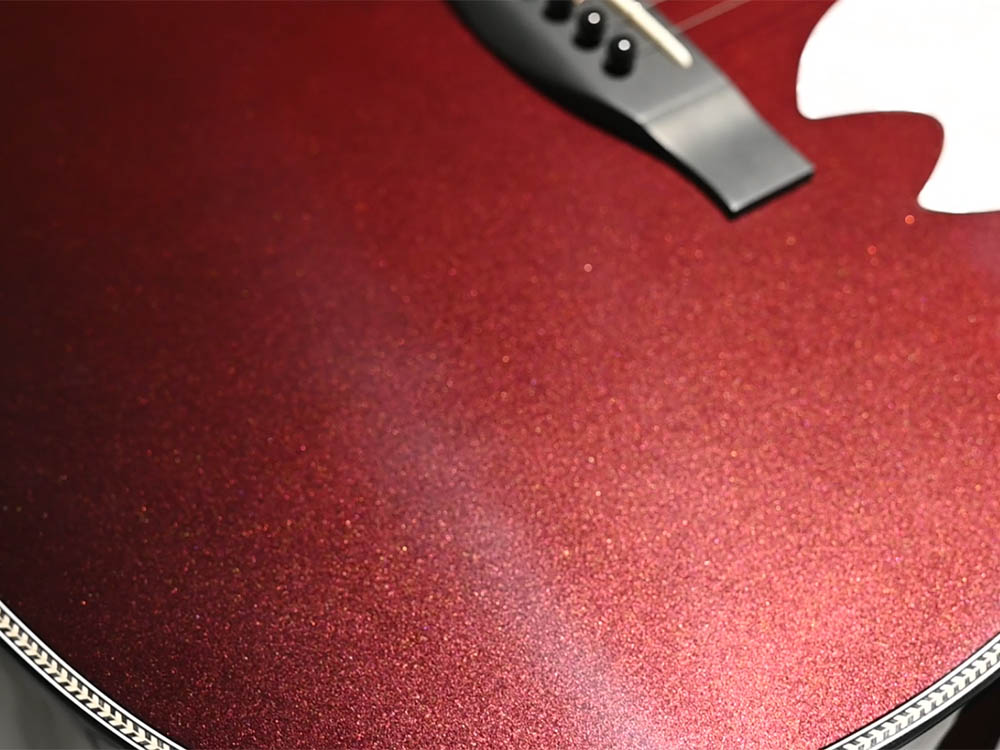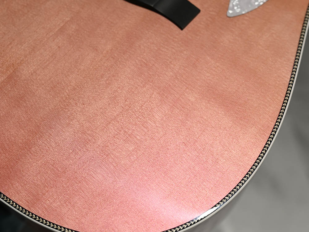 カラーリングは桜の杢目を引き立てる淡い桜色と春の芽吹きを感じる萌木色をグラデーションで表現しています。異なる2色を組み合わせることは繊細な塗装の塗り分けと重なり合う部分の色の表現がキーポイントとなる為、数多の桜ギターを塗り分けてきた塗装職人の技が光るカラーリングです。