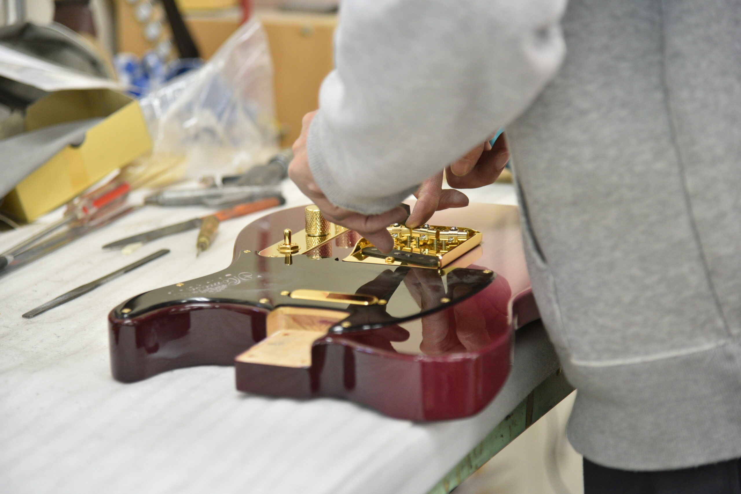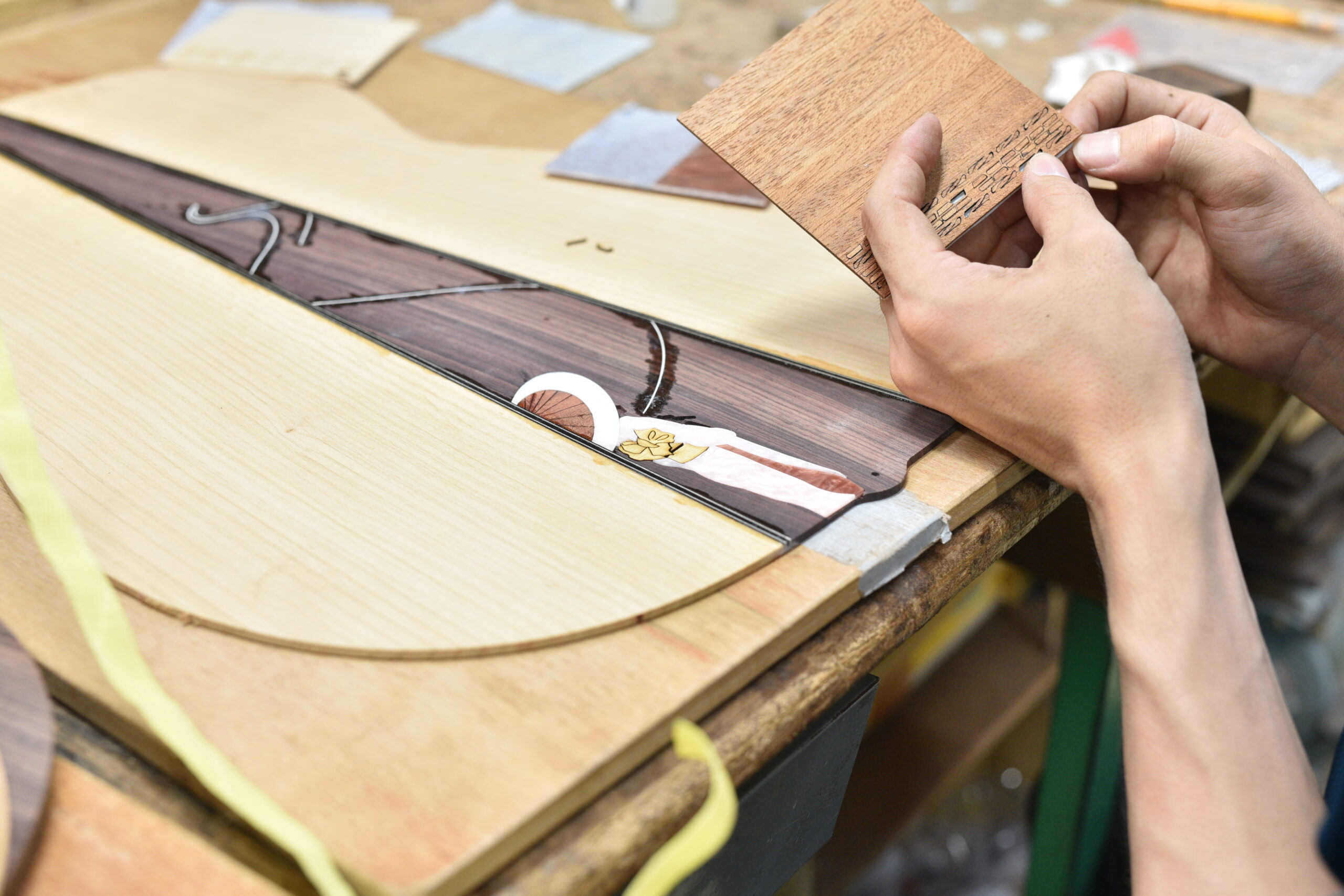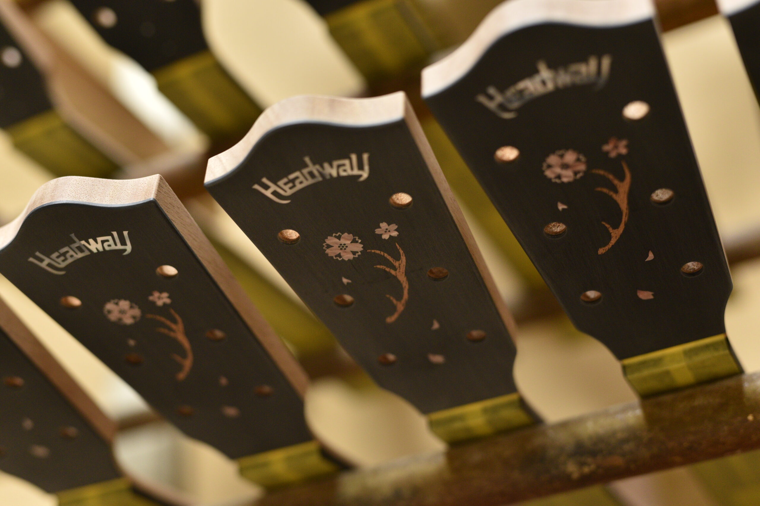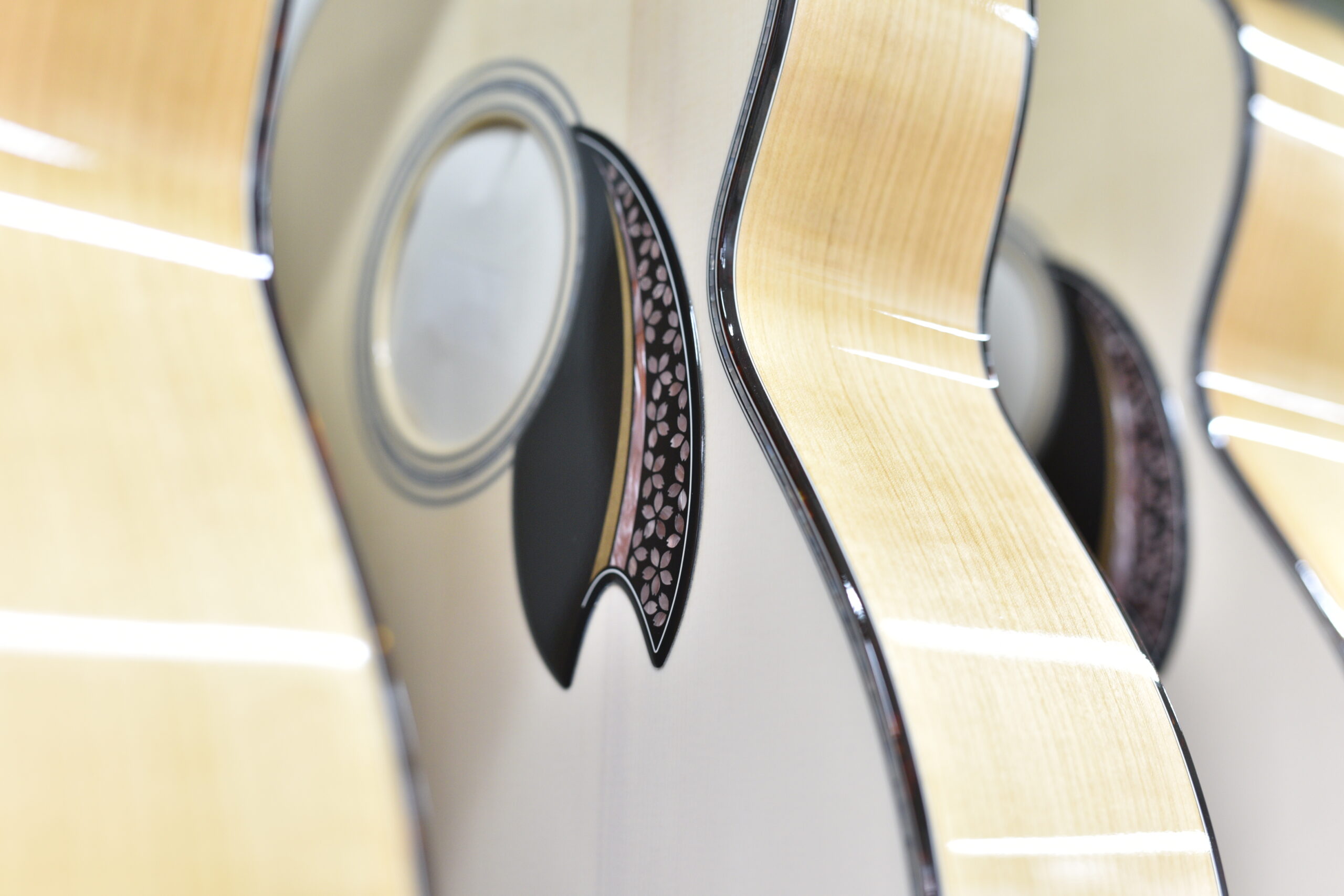 奈良県黒滝村の桜をサイドバック材に用いた、2025年 One Day Guitar Show 限定の桜モデル。 黒滝村に隣接する吉野山の千本桜をイメージし、咲き誇る桜を随所に散りばめました。 県鳥であるコマドリや鹿の角のデザインなど、奈良ゆかりのモチーフも取り入れ、 素材が持つ物語をギター全体で表現しました。