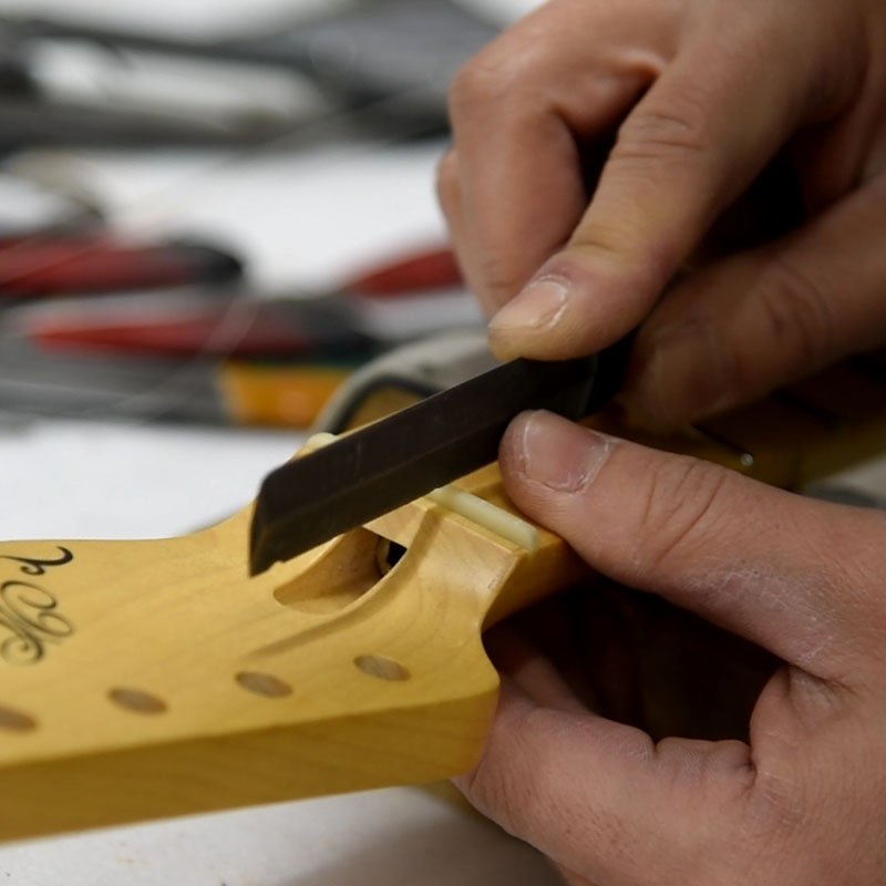 コンパクトサイズでスタイリッシュなルックスのGOTOH® GBU510C-12をベースモデルのペグに採用。GOTOH®による精度の高い造りと、20 : 1のギア比により、安定したチューニングを実現します。