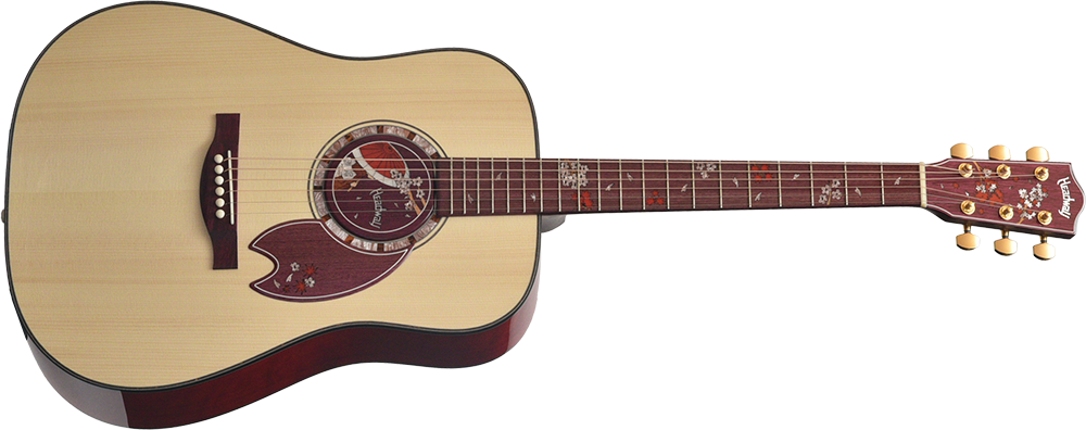 2021年、桜モデルの共通テーマである、”和服の女性”のデザインを取り得れております。サウンドホールカバーをつけることで、まるで小原の四季桜を観光しているような雰囲気になります。秋らしい粧いするべく、着物は薄茶、帯は白、傘には紅葉をイメージいた赤にて仕上げました。そのために6種類の異なる材料を使用して製作いたしました。デザイン面だけでなく、調湿効果、消音効果といった機能面でもメリットの大きいオプショナルパーツとなっております。