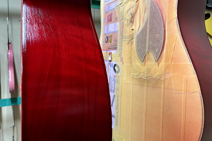 ボディカラーには、紅葉からインスピレーションを受けた四季桜紅(SHIKIZAKURARED)にて着色いたしました。小原の四季桜で目にする紅葉は、四季桜に囲まれているためか、非常に鮮やかな紅として目に写ります。サイド面はより鮮やかに、バック面は中心に向かって薄くなるグラデーションにて仕上げました。初の秋をテーマにした桜ギターにふさわしいカラーリングとなっております。