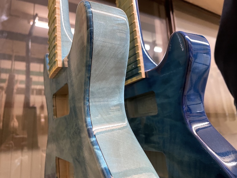 青い塗装のギターやベースは近年人気が高まってきていますが、ギターの製造者にとって”青”は非常に難しい色の一つです。木材の生地はご想像のとおり暖色系の色であることが多く、木目や木肌の質感を活かせるように青い塗装を行う場合、その最終的な発色は木肌の色の影響を大きく受けます。