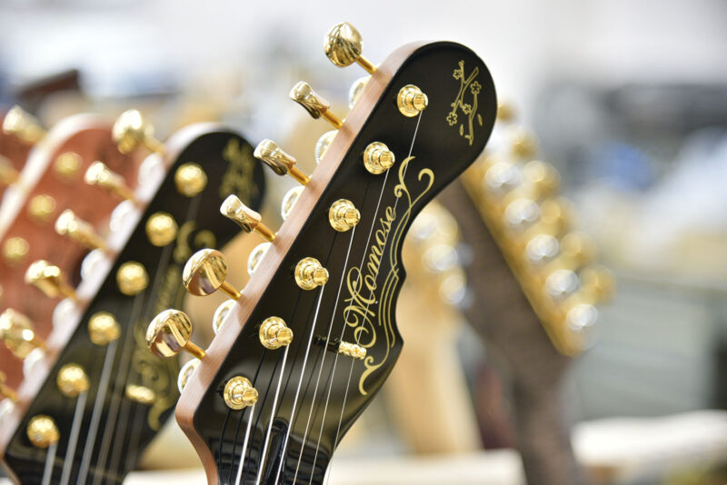 そこで京都伝統の織物西陣織から派生した「京織」の織元である「立野矢」さんへコラボレーションを依頼し、オリジナルの京織で作られた「サウンドホールラベル」と「サウンドホールカバー」が完成しました!生地の心地よい手触りが感じられ、美しい織りを楽器で楽しめる唯一無二のモデルになりました!