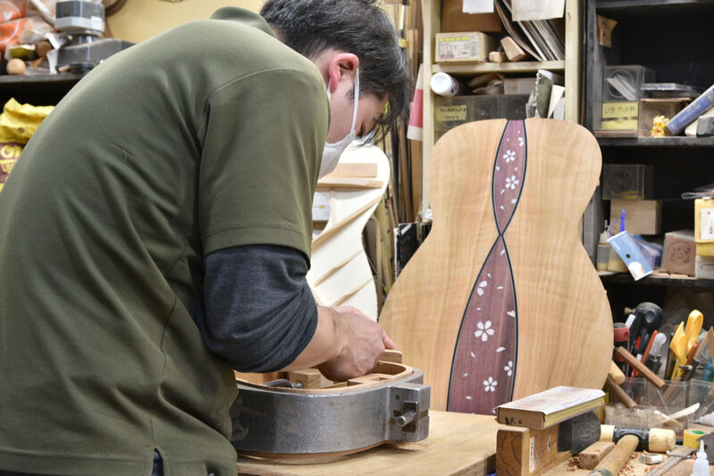 もちろんデザインでも「京都」を表現!鴨川の流れとそこに架かる橋、そして川沿いに咲き誇る枝垂れ桜をテーマに指板インレイからボディバックに至るまでデザインしました。