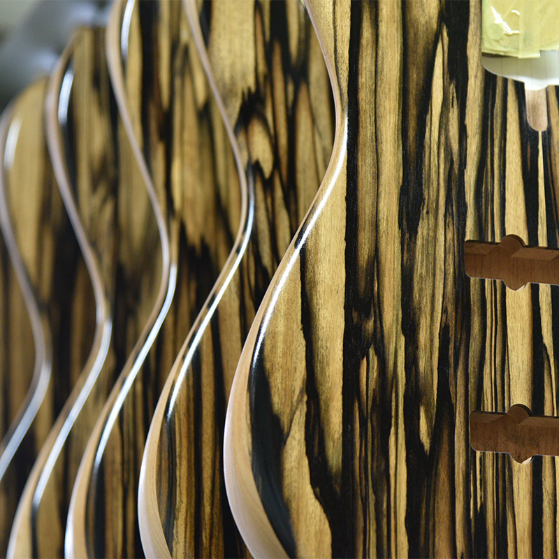 本ラインナップの最大の特徴は「世界で1つのギター」であることです。木々各々の個体が持つ杢目により、すでに2本とない見た目であることはもちろんですが、本ラインナップでは個体ごとに異なるカラーリングやピックガードの組み合わせによって、世界にたった1つの楽器としてお楽しみいただけます。