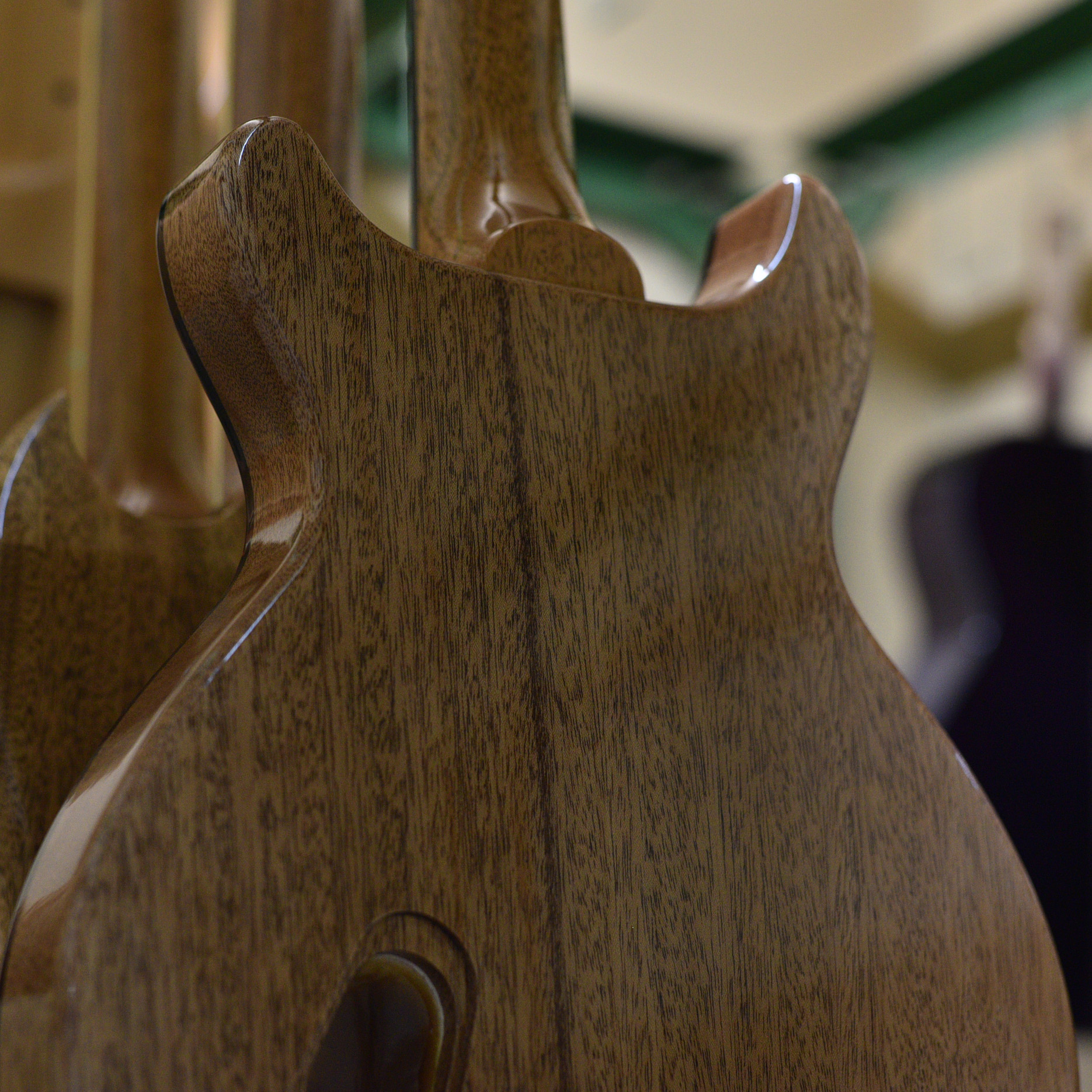 ボディバックに採用されるのは温かみのあるサウンドに定評のアフリカンマホガニー。実機全体の外観はもちろん、ボディトップ材とのかけ合わせによるサウンドも注目です。