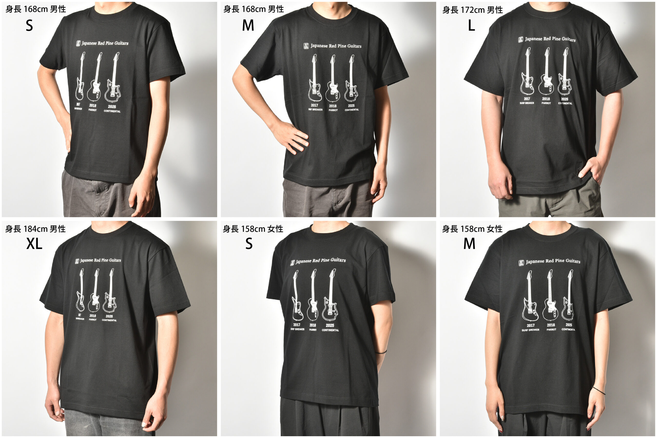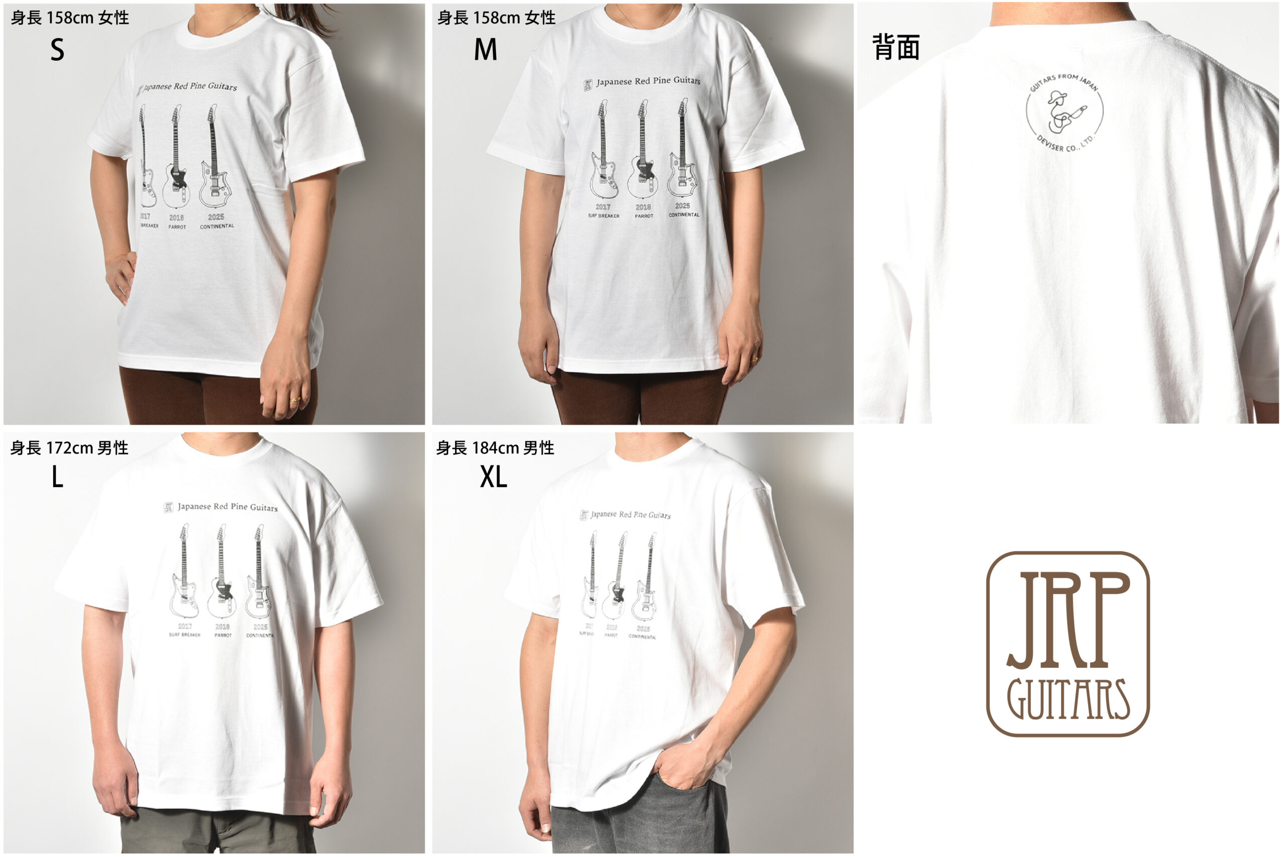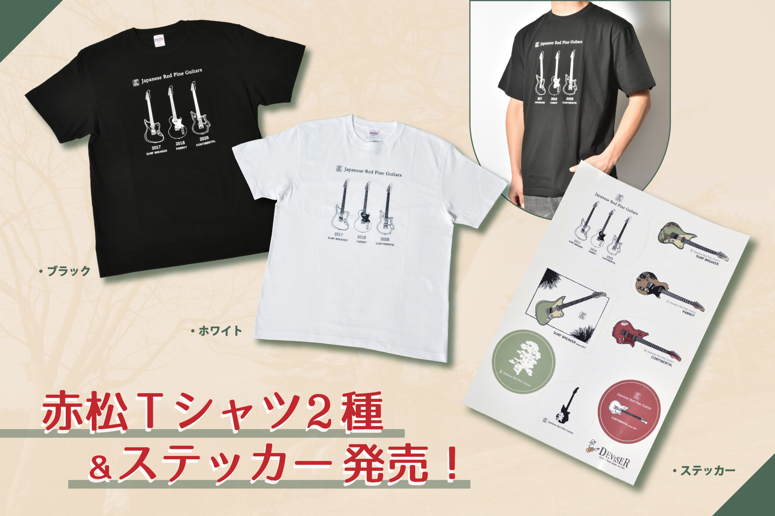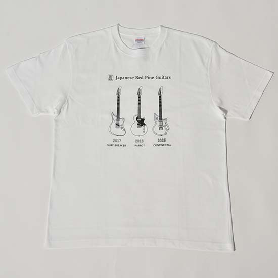 JRP Guitarsブランドの”歴代赤松ギター”をプリントしたTシャツとステッカーが発売決定!看板モデルの「SURF BREAKER」「PARROT」「CONTINENTAL」を手書きでイラストに起こした、赤松ギターファン必見のグッズです。