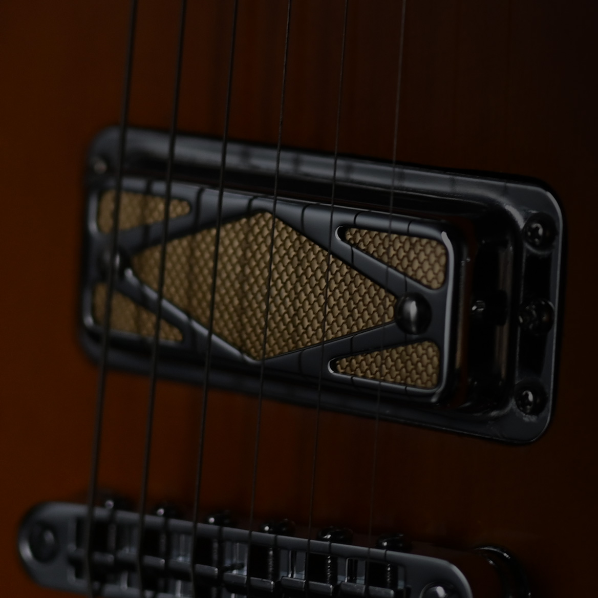 右写真のサンバーストカラーのモデルは「ゴールドフォイル」と呼ばれるタイプのピックアップを搭載。ジャパンビンテージのギターにも採用されていたことから、実機にレトロな風合いをもたらします。マグネットはAlnico5を使用しており、温かみのあるサウンド傾向となるようです。