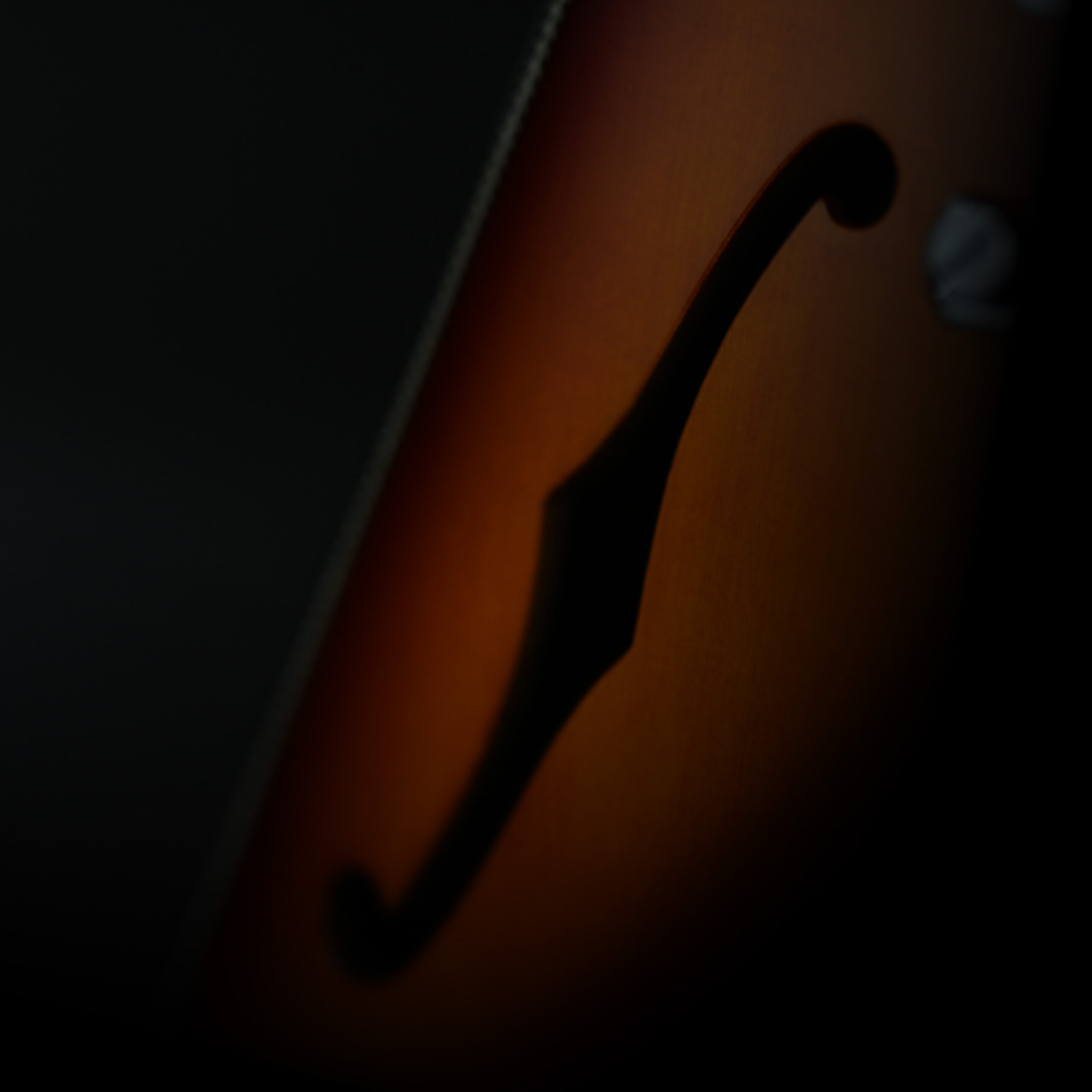 最後にお見せするのがこちら。各モデルにはFホールを有するホロウボディが採用されております。ボディトップ材はアコースティックギター大定番のスプルースで、ホロウボディと相まったエアー感のあるサウンドが期待できる仕様となっているようです。