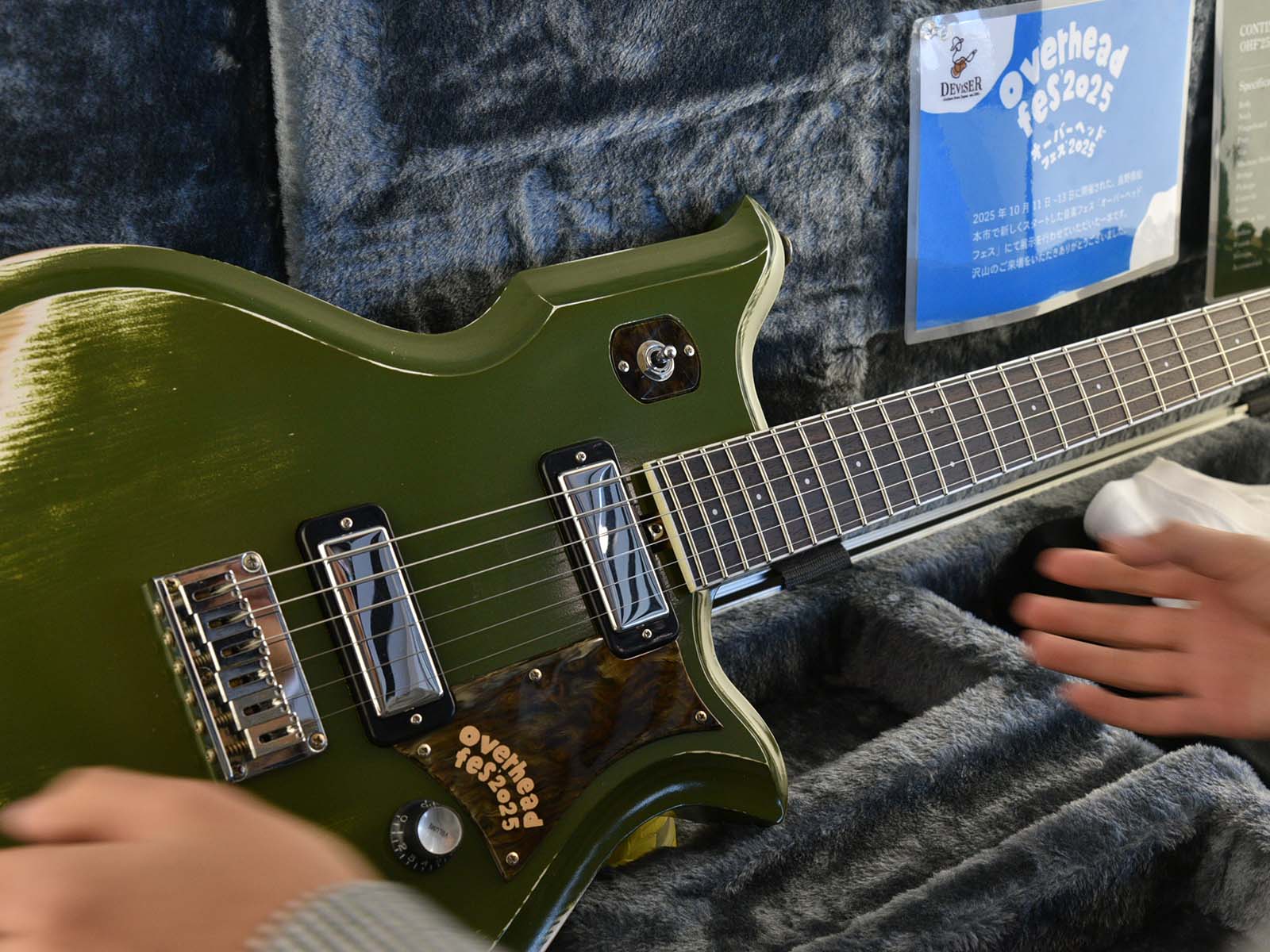 特別仕様のミニハムバッカーを搭載し、ピックガードにはオーバーヘッドフェスのロゴが光ります。従来の赤松ギター同様、ボディやパーツに施された職人の手作業によるエイジド加工にも注目です。