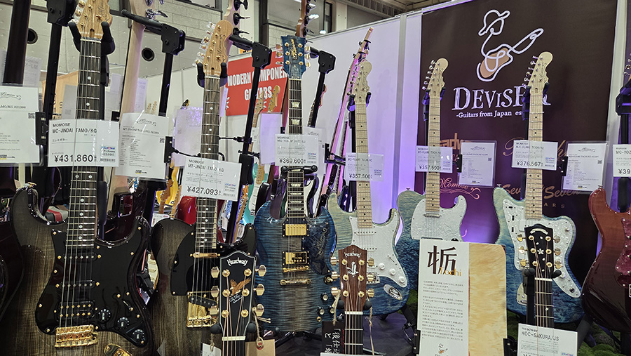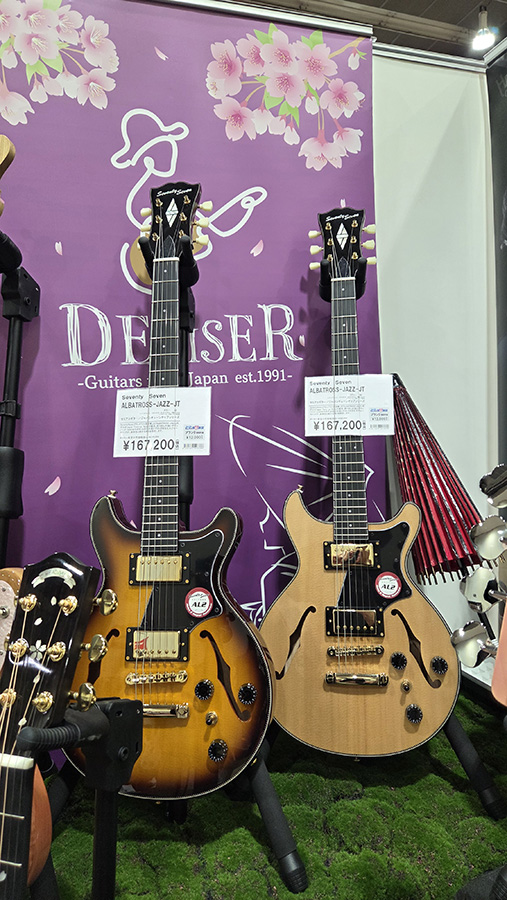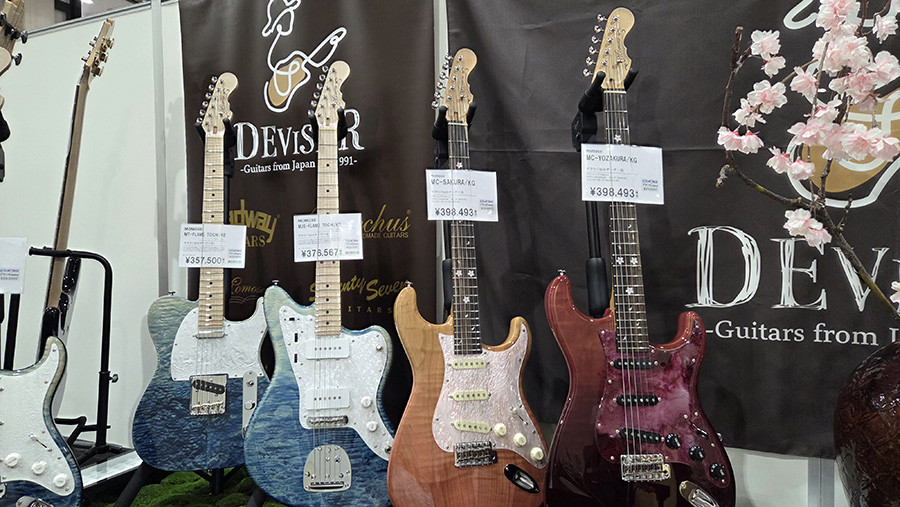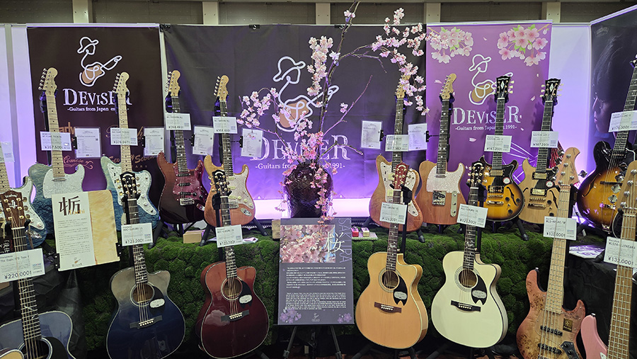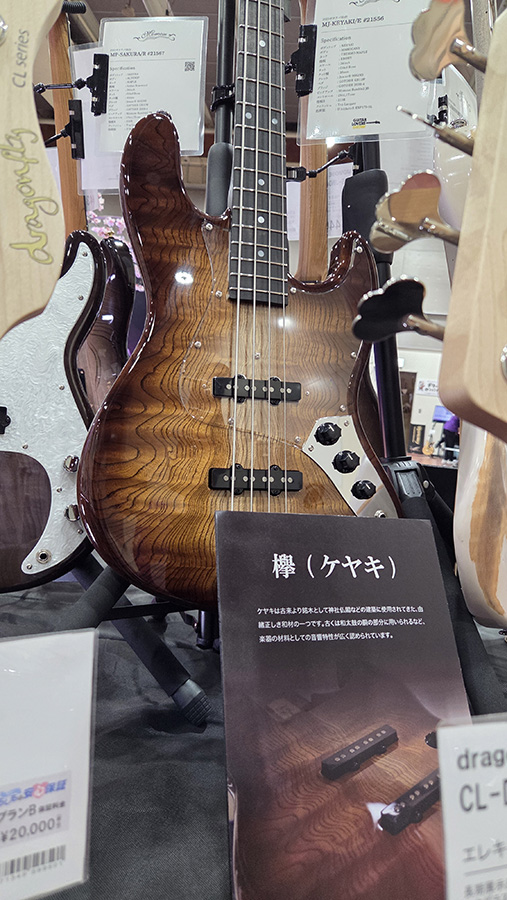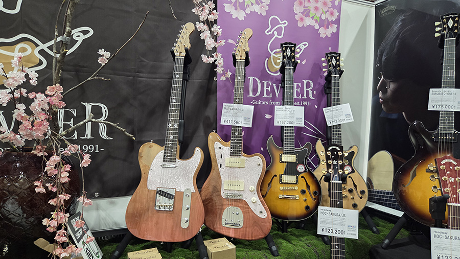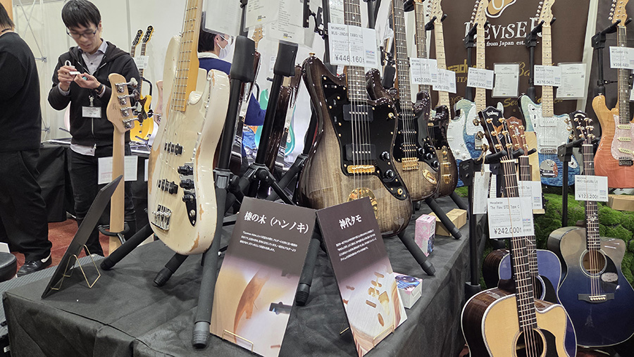 桜や栃と言ったディバイザーブランドを代表する和材はもちろん、希少性の高い神代タモやケヤキ、ハンノキ、クロガキ、カエデを組み合わせエレキギターはオール和材のモデルが並びました!!