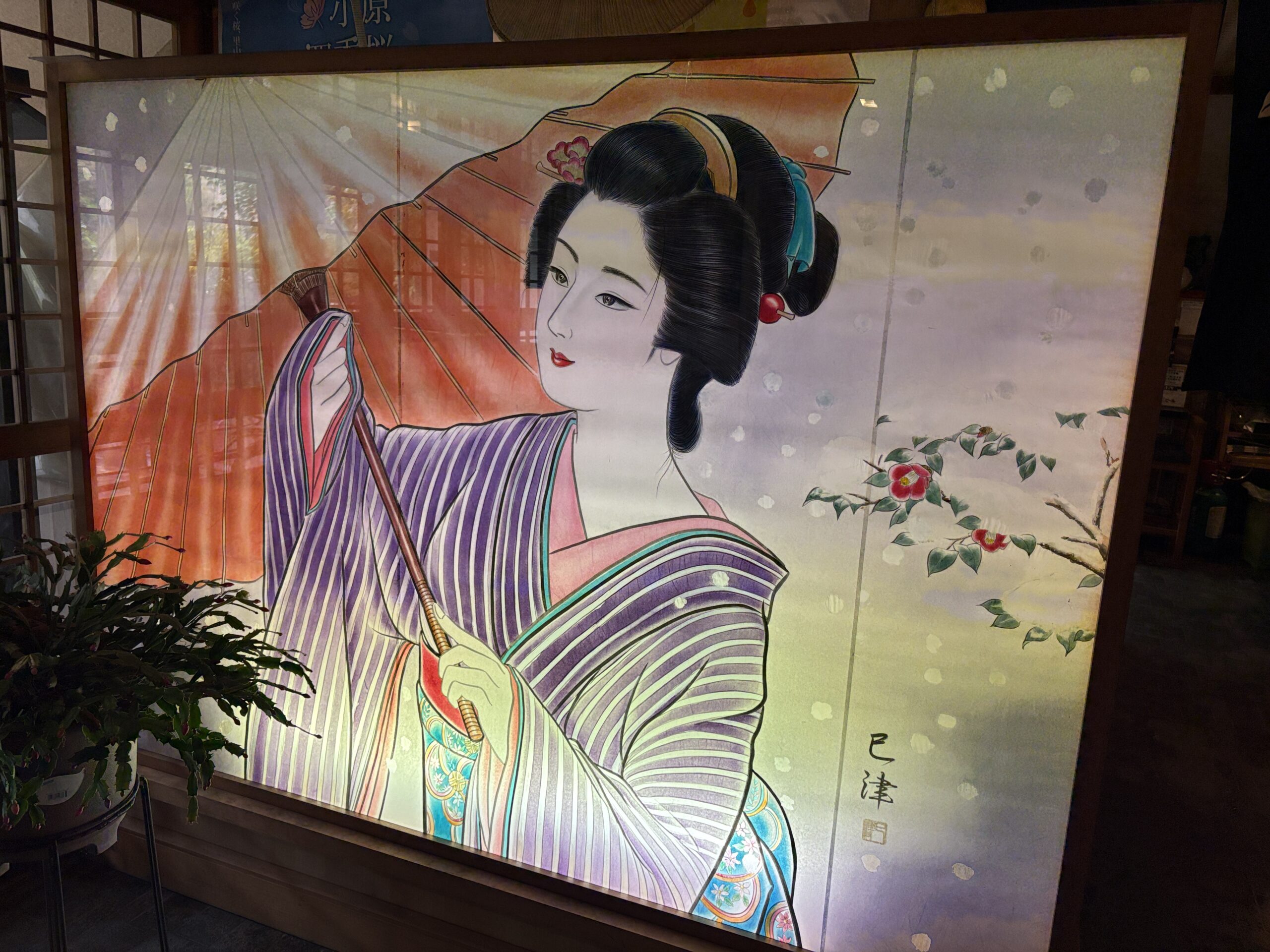 お店の入り口を入ってすぐの場所に和傘の女性!!ディバイザーとのご縁を感じざるを得ません!!