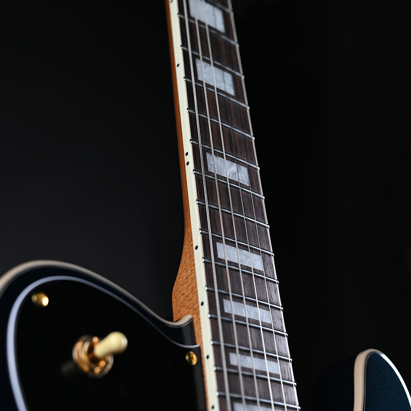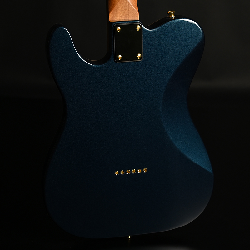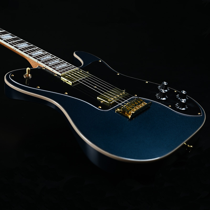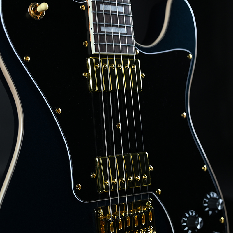 深い青のメタリック塗装を施したDLPBは、落ち着いたダークトーンの中に表情を変えるきらめきが映えるカラーです。指板に用いたローズウッド材の色味とも自然に調和し、高級感のある佇まいを演出します。深みのあるブルーが光の当たり方によって異なる輝きを見せ、落ち着きの中にも確かな存在感をもたらします。