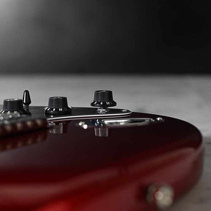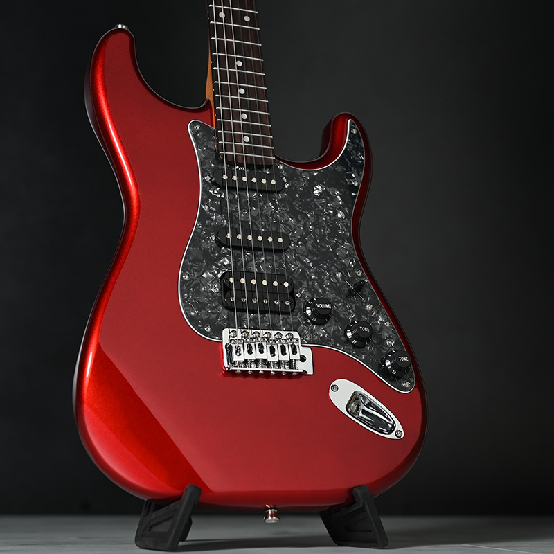 赤を基調にメタリック塗装を施したカラーのCAR。ブラックパールのピックガードとの相性も抜群で、赤と黒のコントラストが洗練された高級さを醸す仕上がりに。ステージでもひときわ映える一本です。