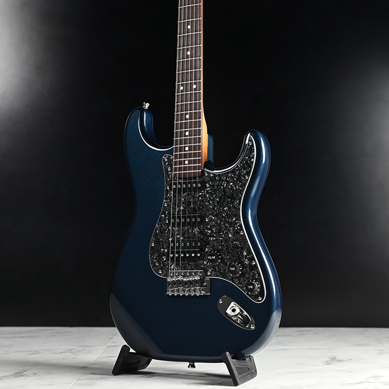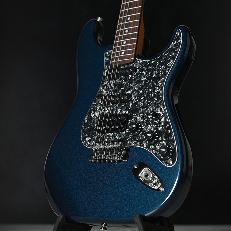 深い青のメタリック塗装のDLPBカラー。ブラックパールピックガードだけなく指板に用いたローズウッド材の色味とも調和し、落ち着きのある雰囲気と共に上質な佇まいを演出しています。