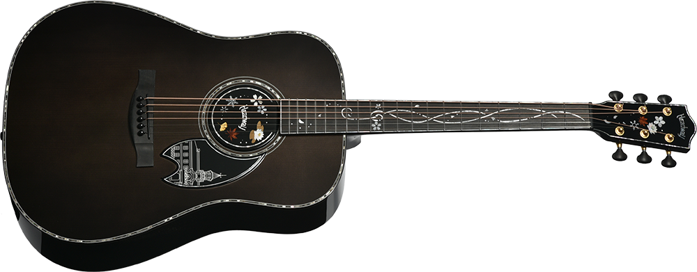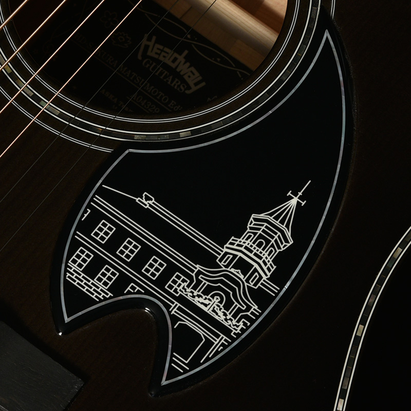 信州・松本を代表する3つの”ガク”のうち、「学」を象徴する国宝「旧開智学校校舎」のデザインをピックガードに取り入れた限定モデルです。指板には桜とト音記号を組み合わせた松本Editionだけの特別なインレイが装飾されています。