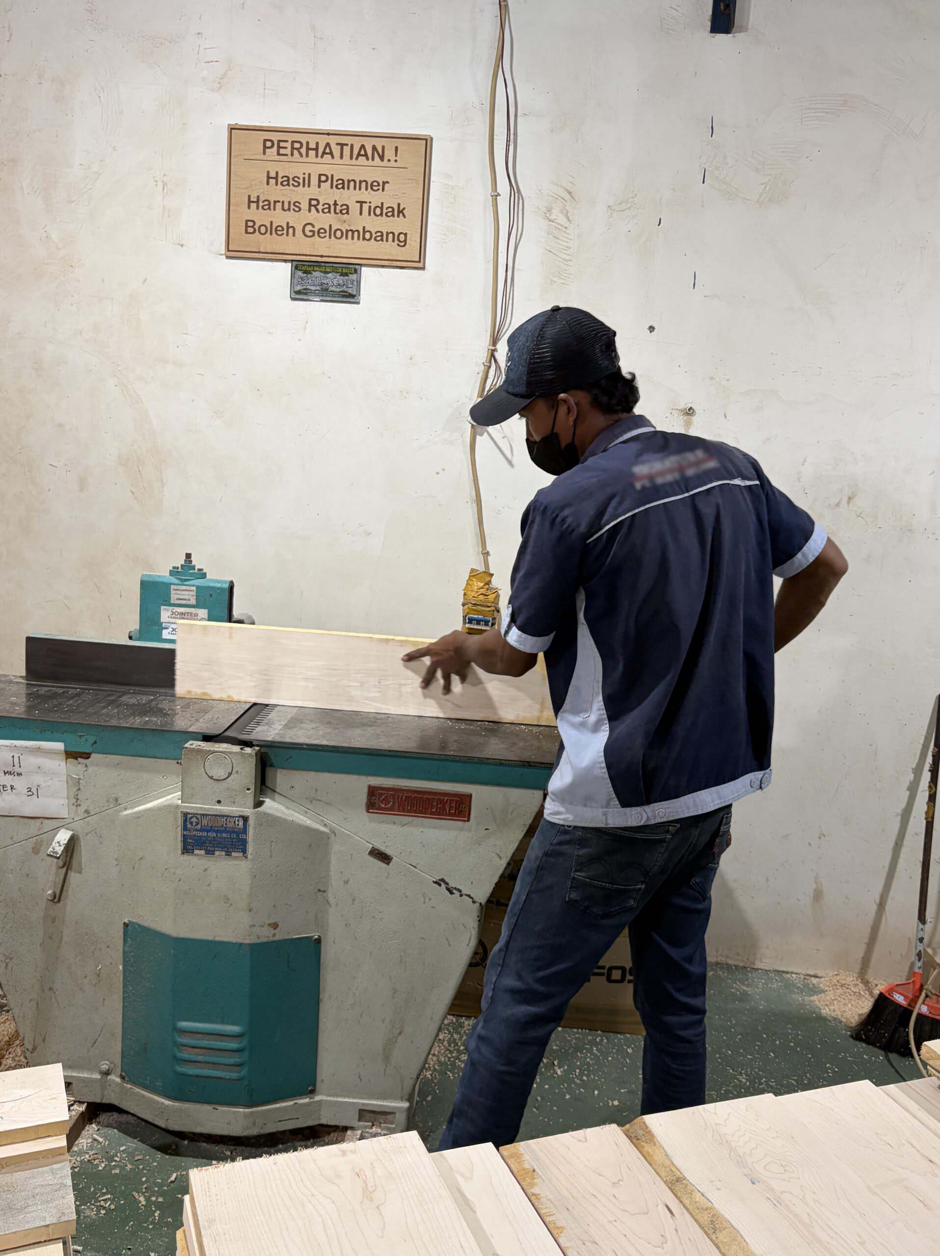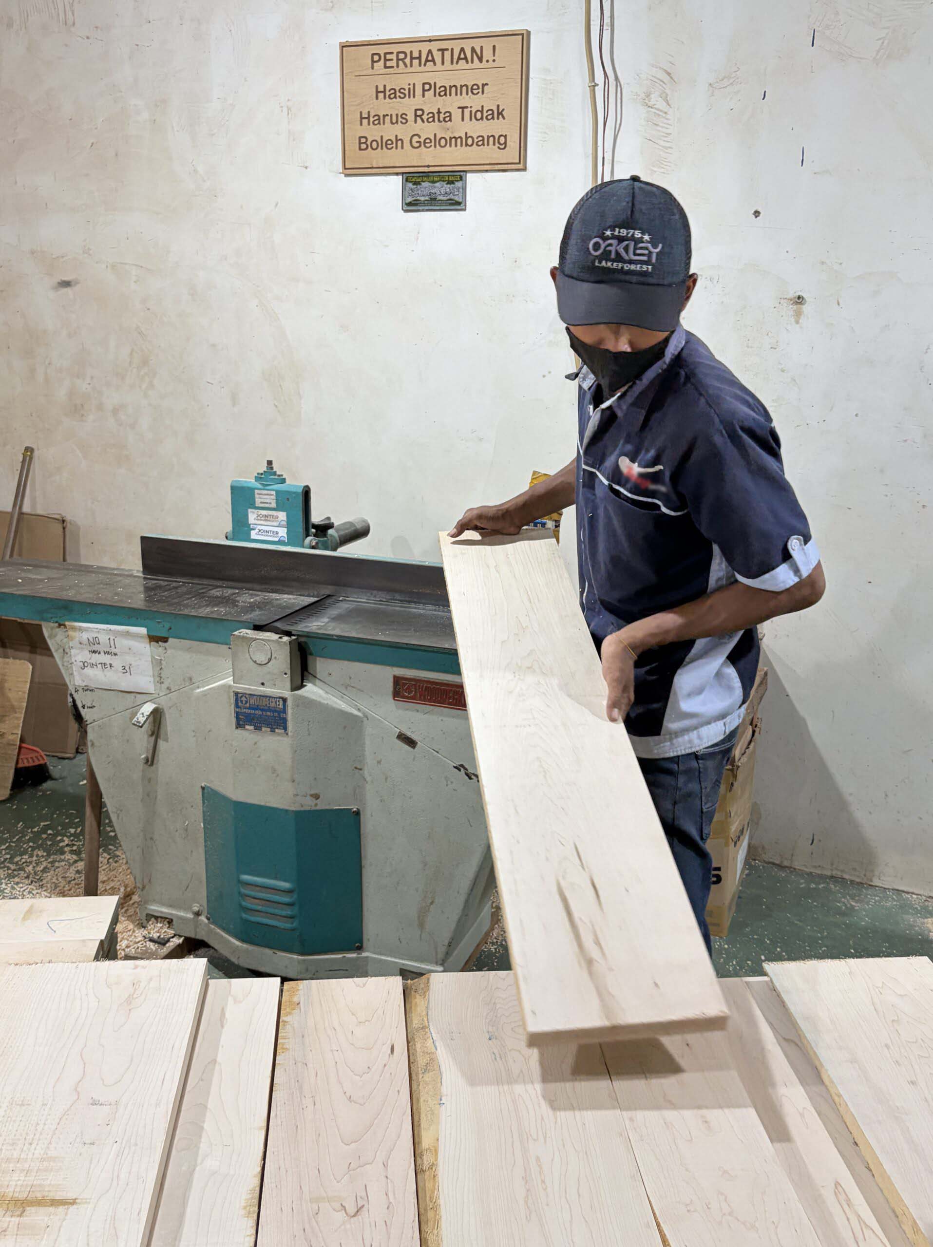 木材を次工程へ進めるため、手押しカンナを用いて大まかな厚みだしをおこないます。