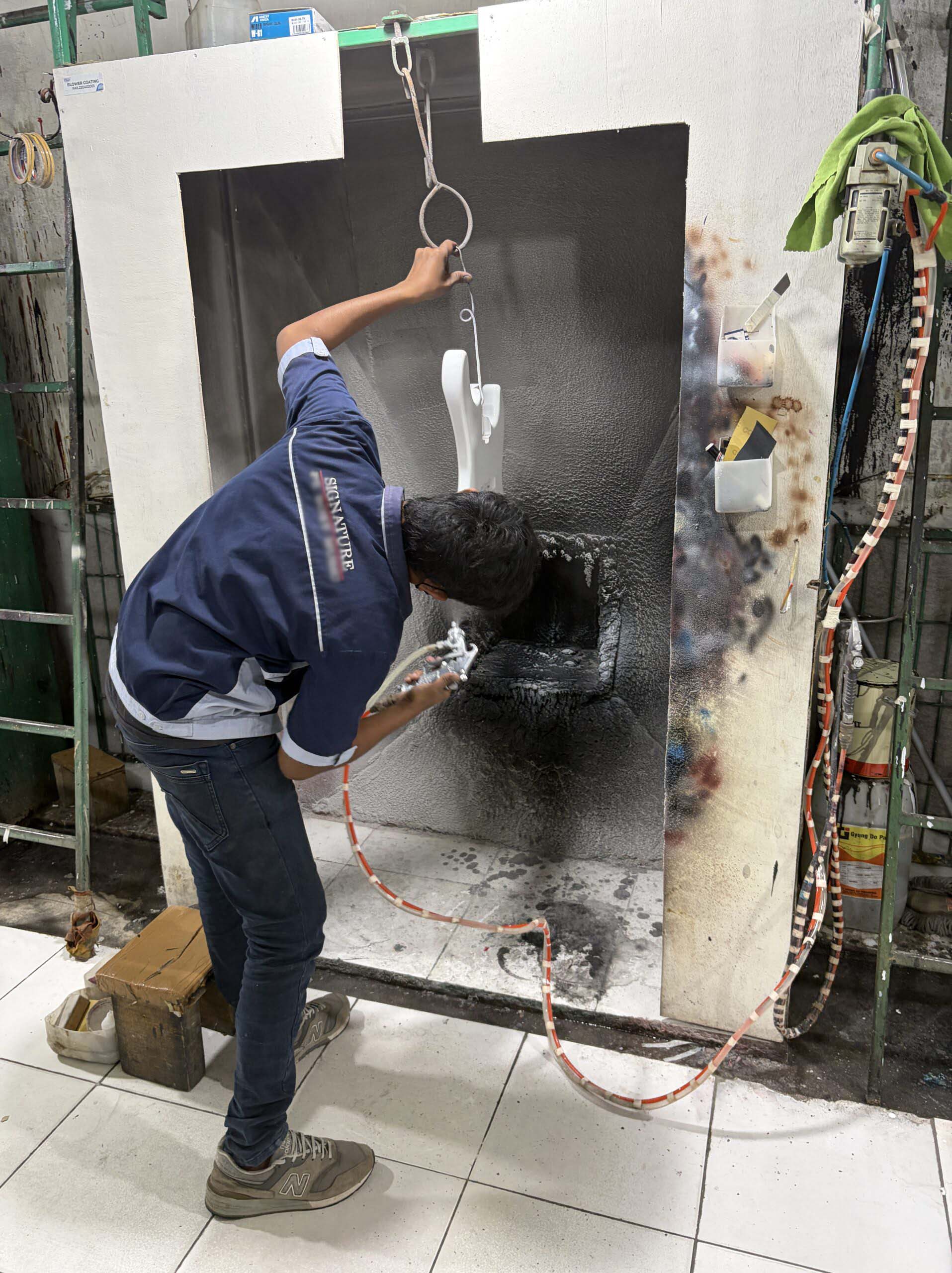 しっかり研磨されたボディを、熟練のワーカーがスプレーガンで着色をおこなっていました。