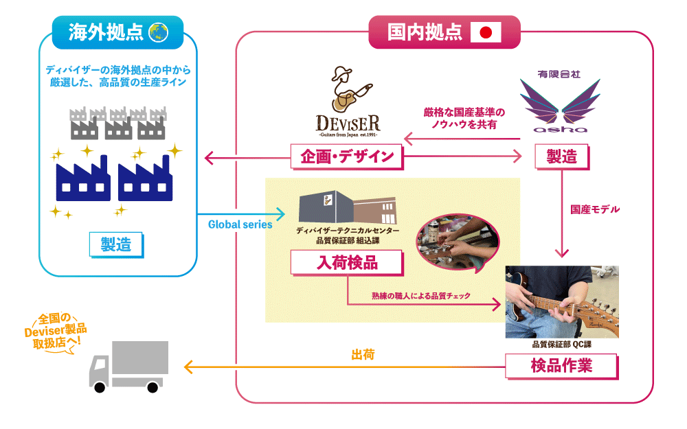 飛鳥で培われた品質改善、ギター製造のためのノウハウをディバイザーは海外工場にも共有し、品質向上に努めています。