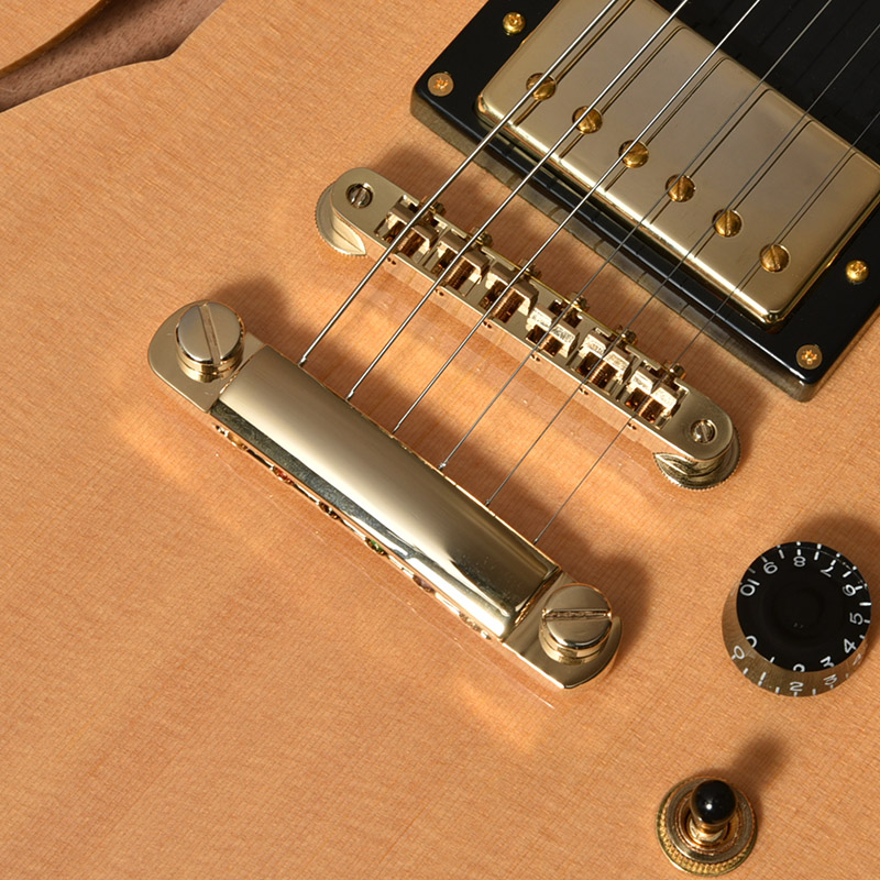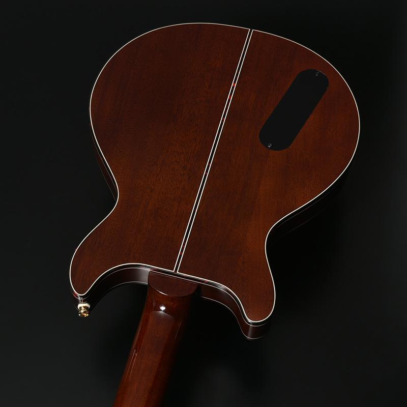 ボディ内部を大きくくりぬくことにより、弦振動の豊かな反響を生み出すチャンバード・セミホロウ構造を採用。ブリッジやテイルピース、ストラップピンを固定する部分など木部の強度が必要な部分は厚く残しながらも、それ以外の部分を出来る限りくり抜くことで、堅牢性を保ちながらも大きいホロウ空間を作りだしています。