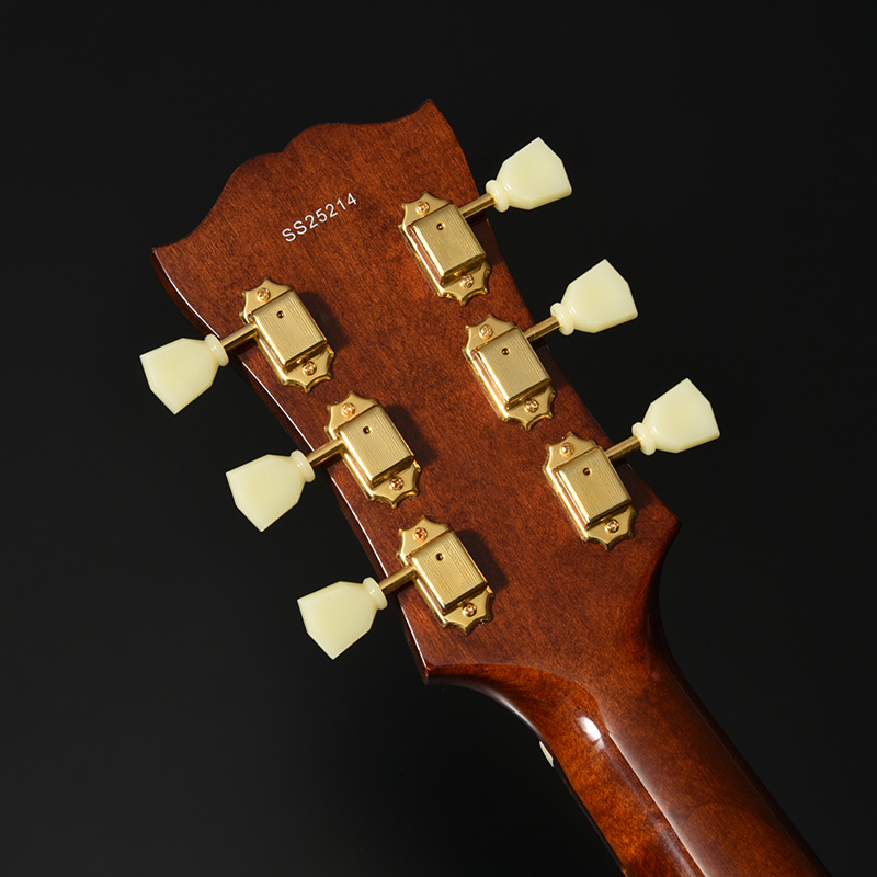 軽量で取り回しの良い小ぶりなチャンバード・セミホロウボディ、反応の良いアタックを生み出すスプルーストップ、ハーフヘリンボーンのパーフリングやスモールドットポジションマークなどの控え目ながらもトラッドな装飾など、これまでの仕様とデザインのベースとなるポイントを踏襲しています。