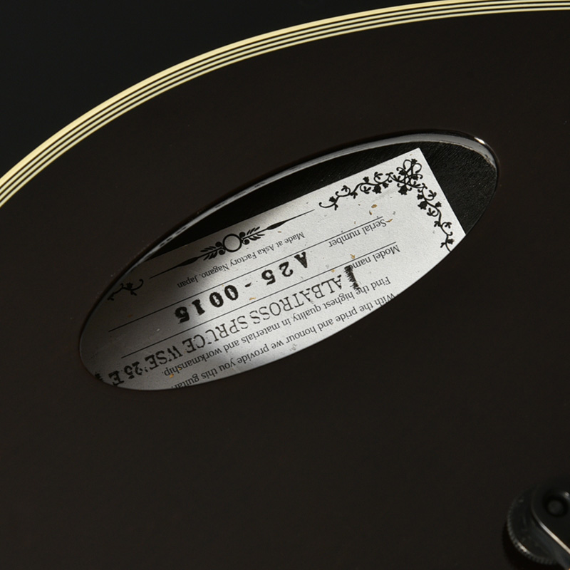 ボディトップにはアコースティックギターの材料として知られるスプルース材を使用。ホロウボディのALBATROSSにとって理想の音響特性を持った木材です。バック材としては、和材の中でも相性の良いトチを採用しています。中~高音域にかけて抜けの良いサウンドを持つ木材で、アコースティックなトーンの中にもエレキギター然とした芯のあるサウンドを確立しています。