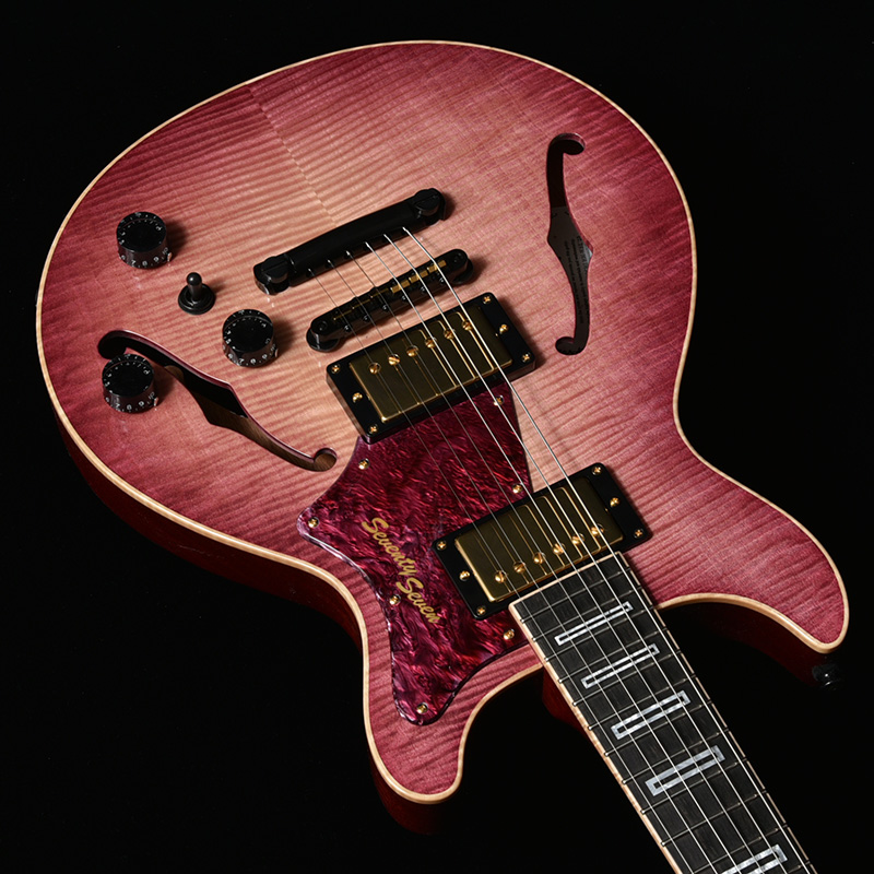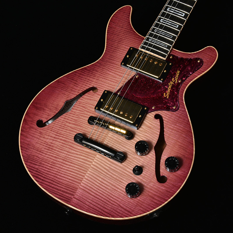 空洞部分をくり抜くチェンバー構造とは異なり、一度ボディ全体をくり抜いてからセンターブロックを配置しております。この構造により、小さいボディながらも豊かな低音とふくよかな生鳴りを実現しています。センターブロックにはメイプル材を使用しており、ボディ材のマホガニーが持つマイルドな音色の中にキレと輪郭を併せ持たせるためにこの組み合わせになっております。耐久性を残しながら程よく面積を削ることにより、ホロウボディらしいエアー感とソリッドなレスポンスを両立させております。