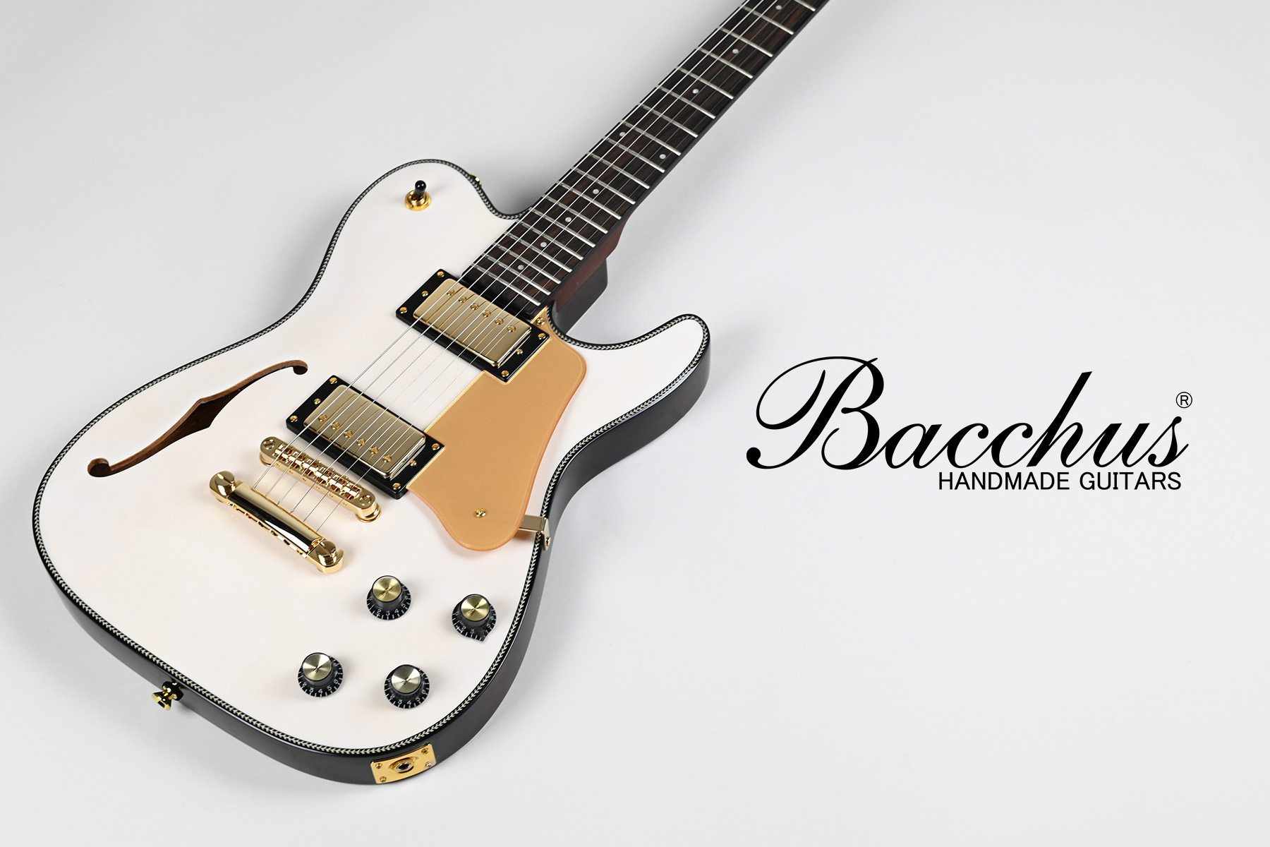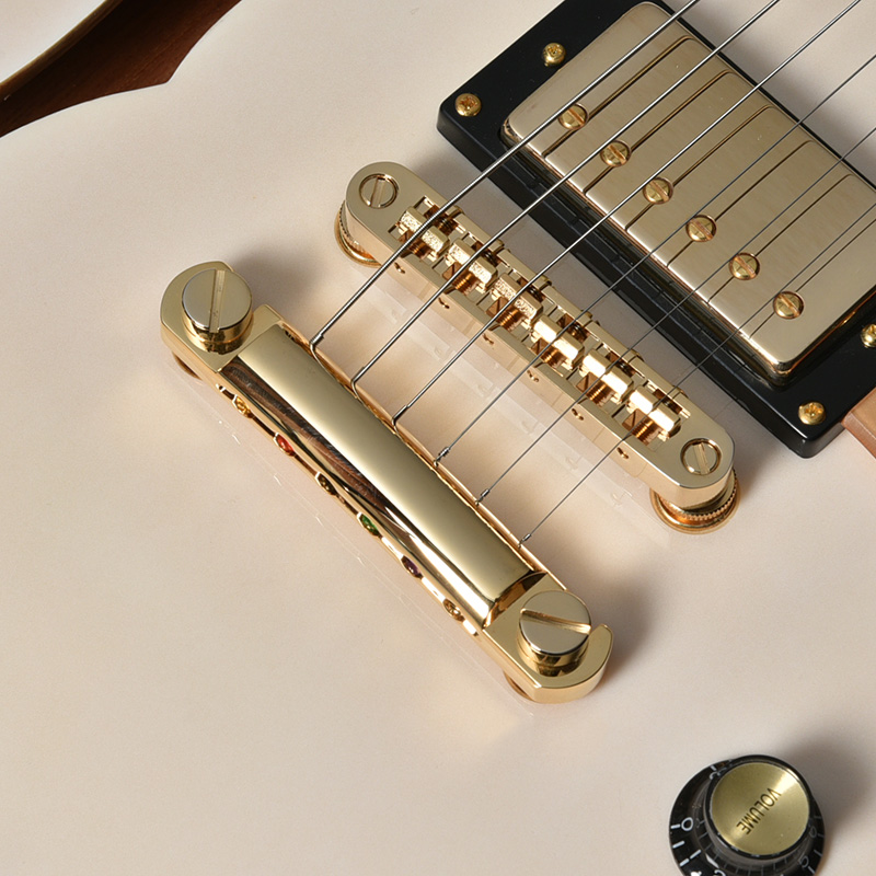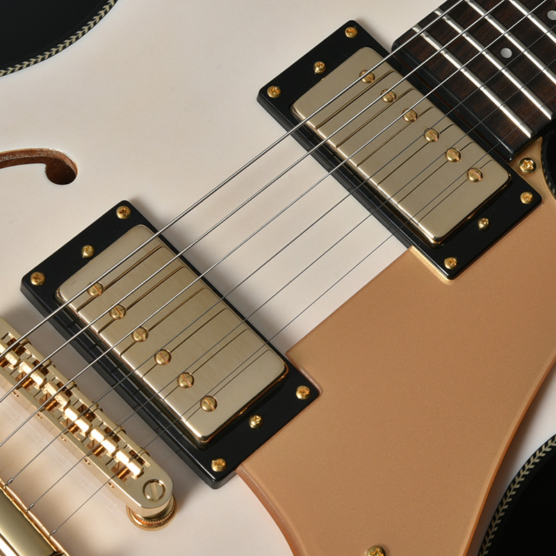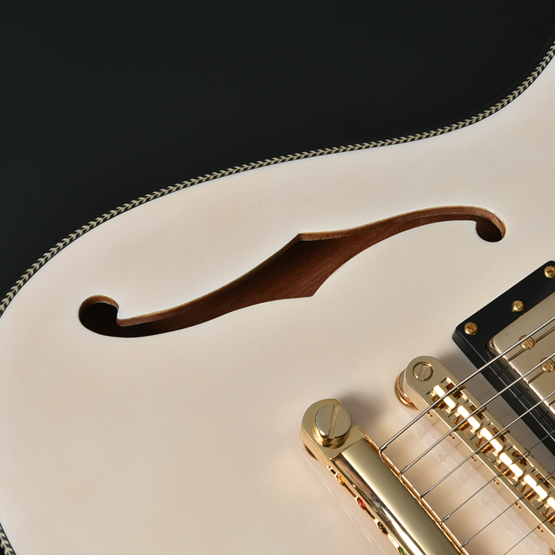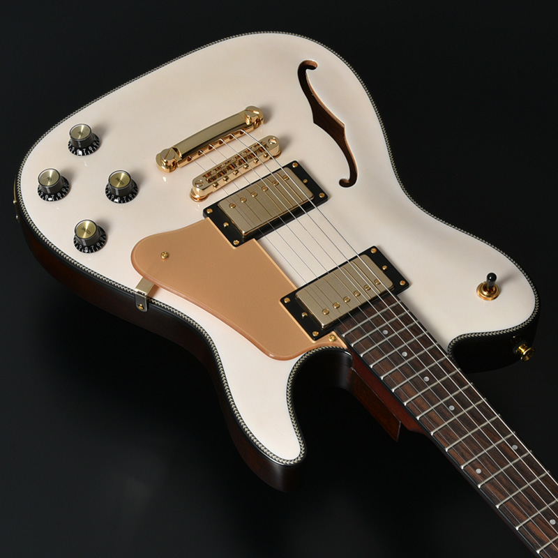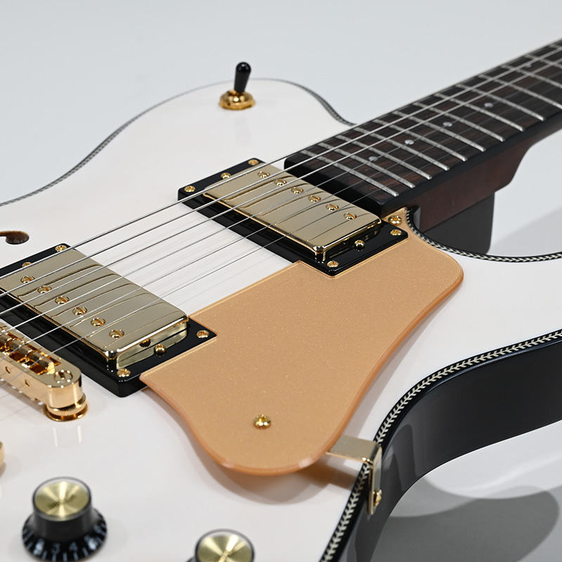 セミホロウボディが特徴のBARON-JAZZモデルに、スノーホワイトカラーとゴールドパーツのコンビネーションが美しい新製品が登場。木材の個性を楽しめるシースルーカラーでのフィニッシュが特徴です。マッチングカラーのアクリル製ピックガードを装備し、よりゴージャスな仕様を追求しました。