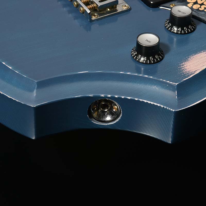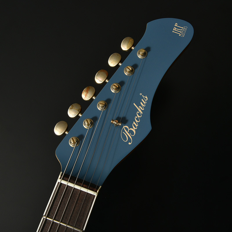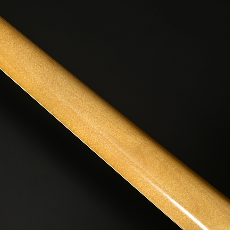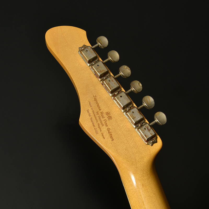 赤松の持つ節やシミを個性として捉え、全体的なデザインに馴染むようボディとヘッドストック、そして金属パーツにエイジド加工を施しています。
