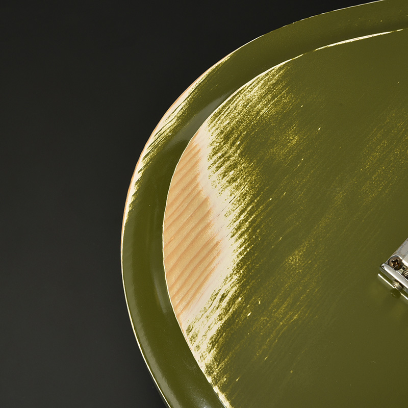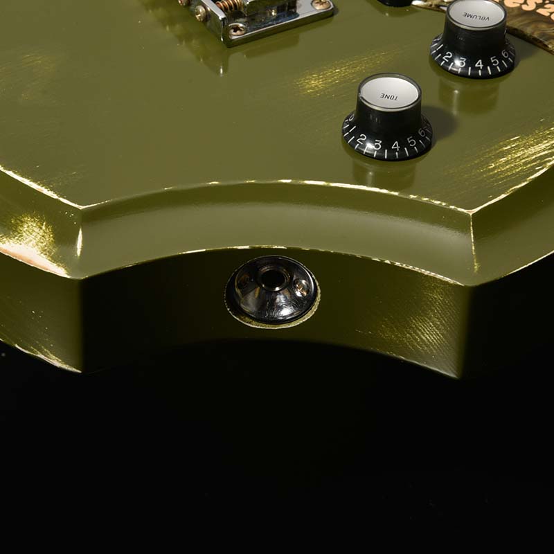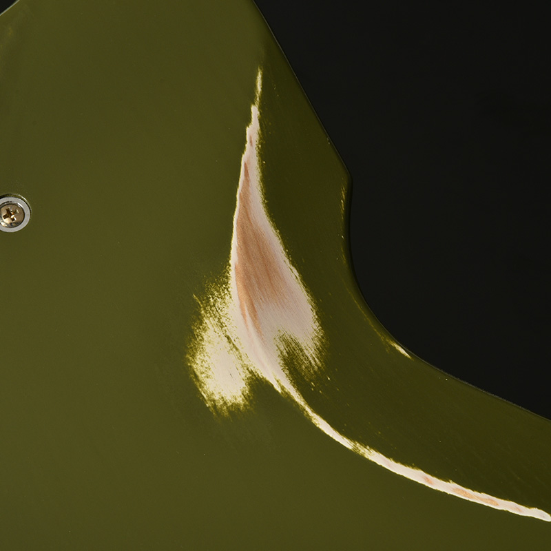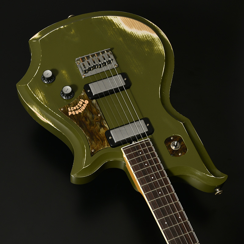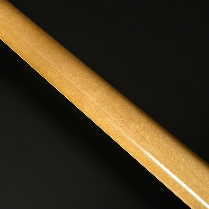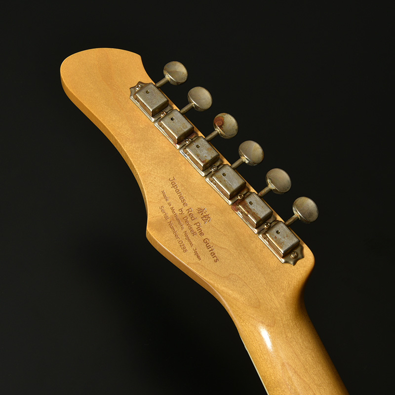 赤松の持つ節やシミを個性として捉え、全体的なデザインに馴染むようボディとヘッドストック、そして金属パーツにエイジド加工を施しています。
